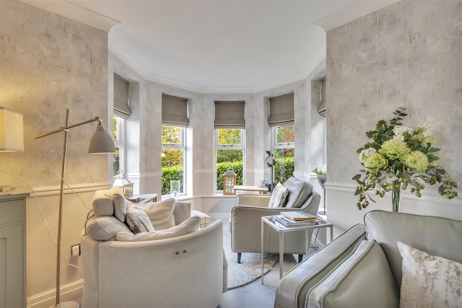 Impressive Lounge - 6.73m x 5.05m (22'1 x 16'7) - Glazed double doors from hall, living flame log effect gas fire, 2 double glazed windows and deep five sided bay window, an ideal area for relaxation or reading, 3 central heating radiator, dado rail, tv point, 3 wall lights,