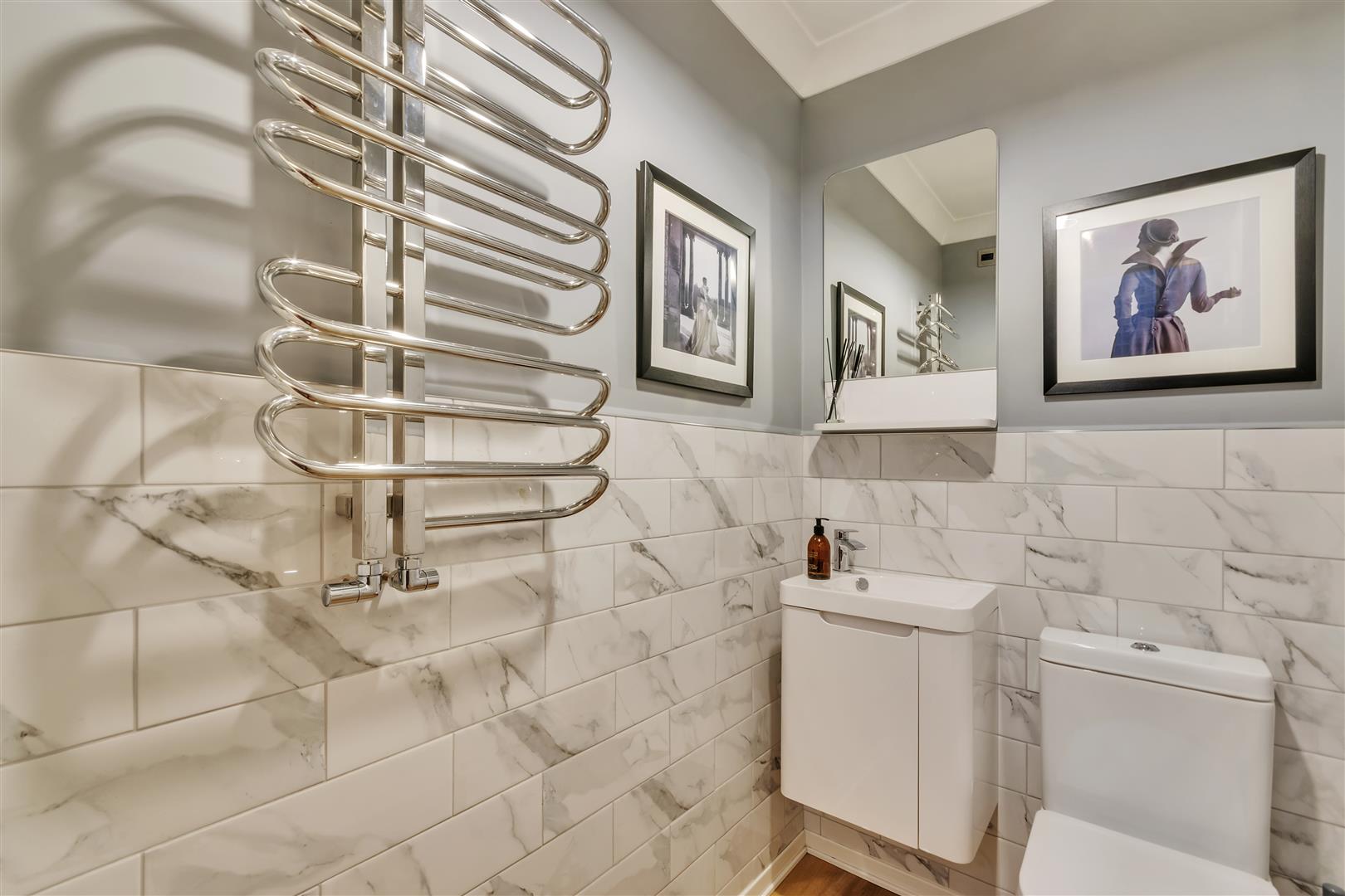 Cloakroom - W.C, wash hand basin, tiled floor, half tiled walls, coved ceilings, tubular towel radiator