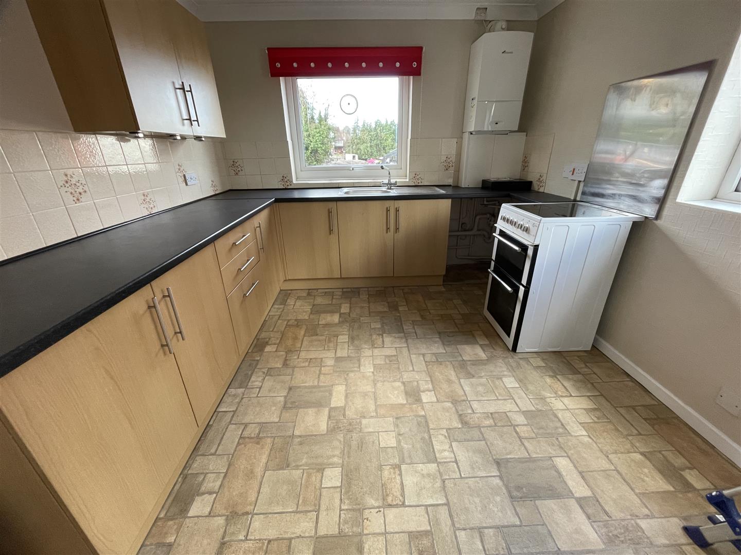 Kitchen Breakfast Room - 3.5 x 2.9 (11'5" x 9'6") - Stainless steel sink unit, 2 double glazed windows, wall and base cupboards, black work top surfaces, gas central heating boiler, plumbing for washing machine, central heating radiator