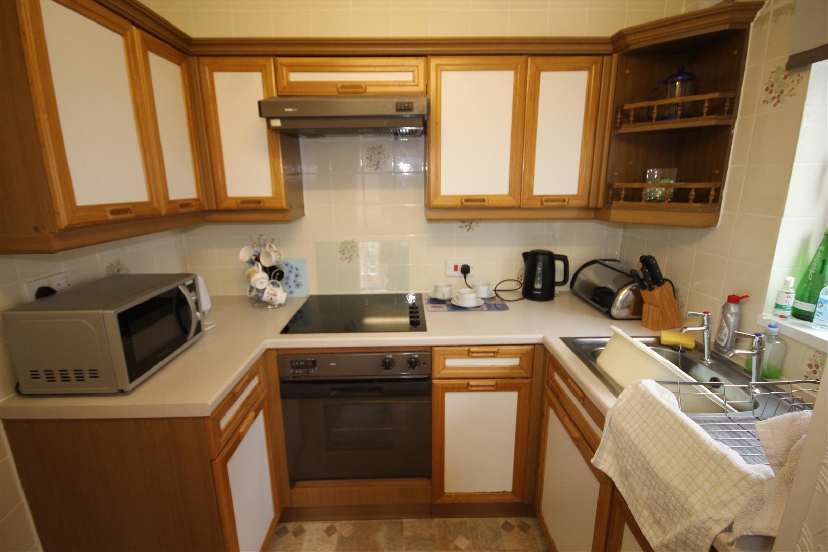 Kitchen - 2.2 x 1.6 (7'2" x 5'2") - Stainless steel sink unit, base cupboards and drawers with wood trim, 4 ring electric hob unit, built in electric oven, cooker extractor hood, double glazed window, part tiled walls,