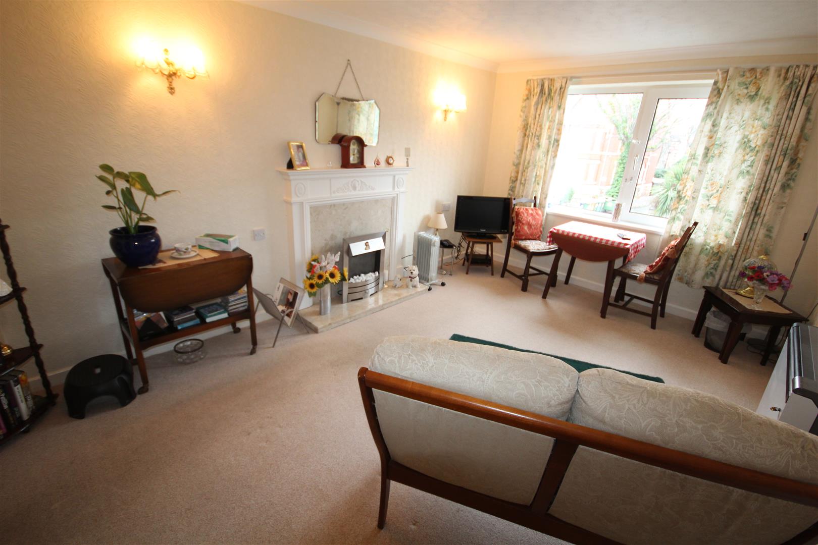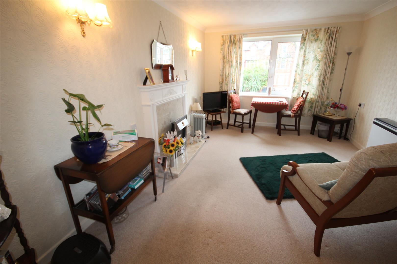 Lounge Dining - 4.7 x 3.1 (15'5" x 10'2") - Decorative fireplace surround with marble inset and pebble design electric fire, double glazed, night storage heater, coved ceilings