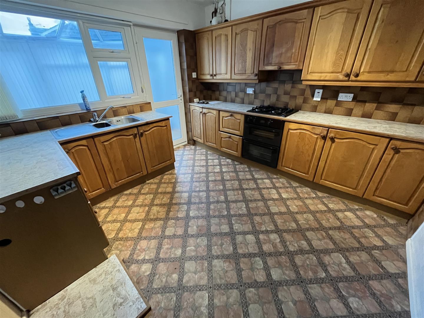 Kitchen - 3.4 x 3.3 (11'1" x 10'9") - Range of oak style base cupboards and drawers, work top surfaces, wall units, double glazed window and back door, 4 ring gas hob unit, built in oven cooker extractor hood, gas central heating boiler, central heating radiator, stainless steel sink unit