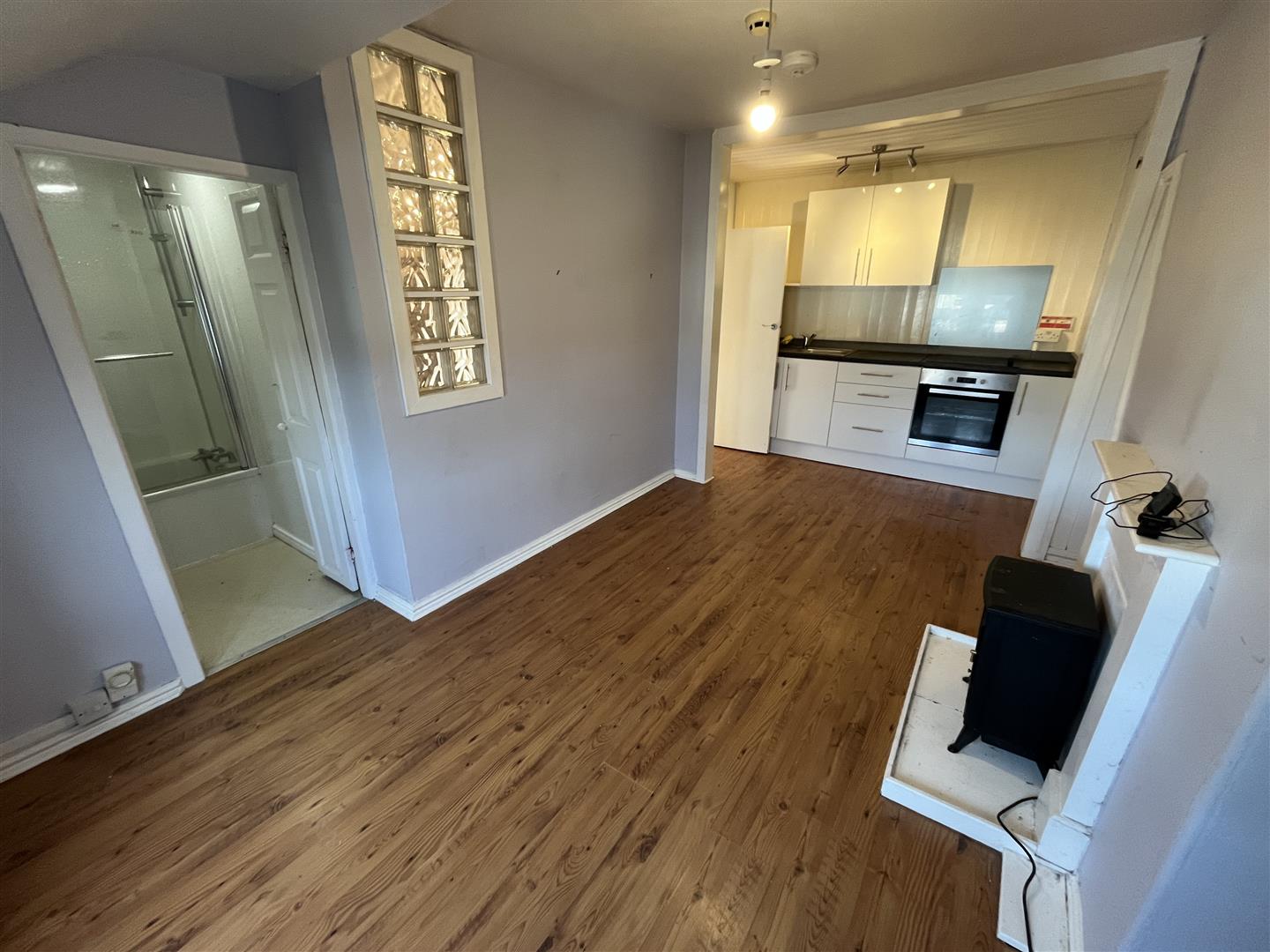 Open Plan Living Room Kitchen - 4.65m x 3.58m (15'3 x 11'9) - Laminate flooring, 2 double glazed windows, stainless steel sink unit, 4 ring electric hob unit. built in oven, wall cupboards, base units, 2 shaped display alcoves