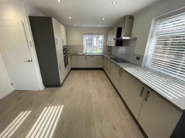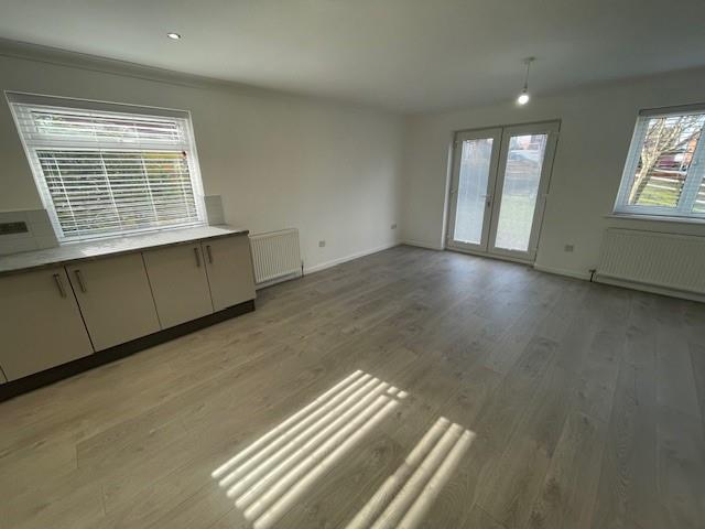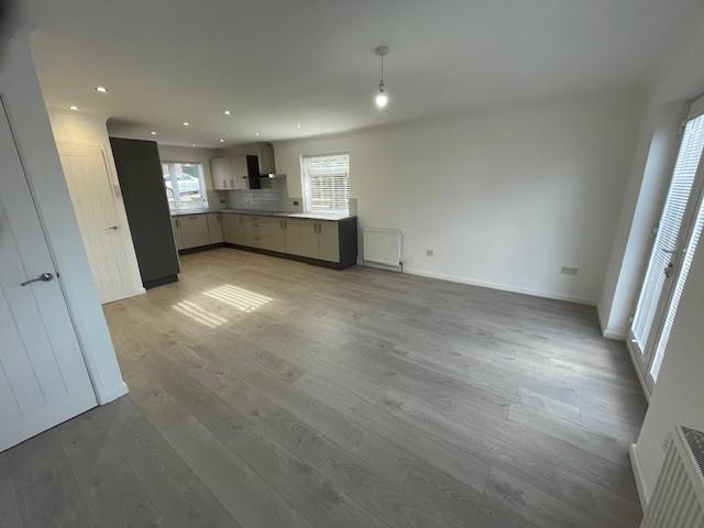 Open Plan Living Room & Fitted Kitchen - 7.7 x 2.6 and 2.8 and 3.8 (25'3" x 8'6" and 9'2" a - Grey laminate flooring, under stairs cupboard, coved ceilings and inset lighting, double glazed french doors to rear gardens, 2 central heating radiators, range of grey base cupboards and drawers with leather effect work top surfaces, pan drawers, 3 double glazed windows, coved ceilings, built in AEG hob unit and double oven, stainless steel cooker hood, stainless steel sink unit, fridge freezer, built in washing machine and dishwasher