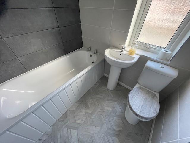 Modern Bathroom - 1.8 x 1.6 (5'10" x 5'2") - Panel bath, pedestal wash hand basin, w.c, tiled walls in grey and cream, shower unit, double glazed, heated towel radiator