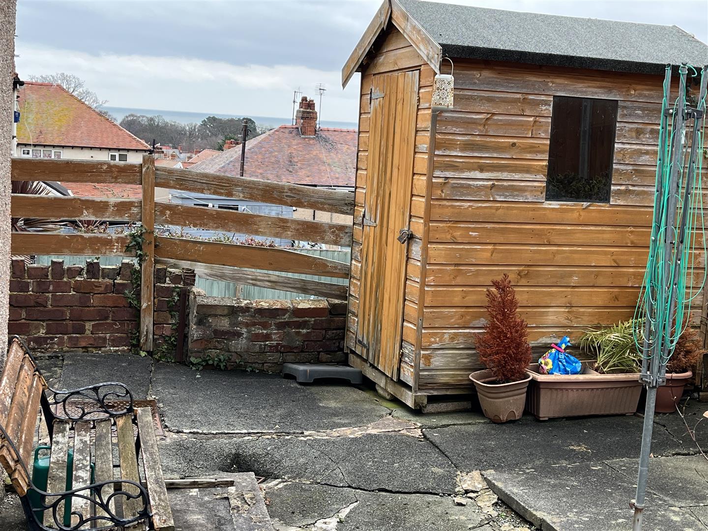 Outside - Patio garden at the rear of the house, distant sea views, Garden Shed, Small front garden