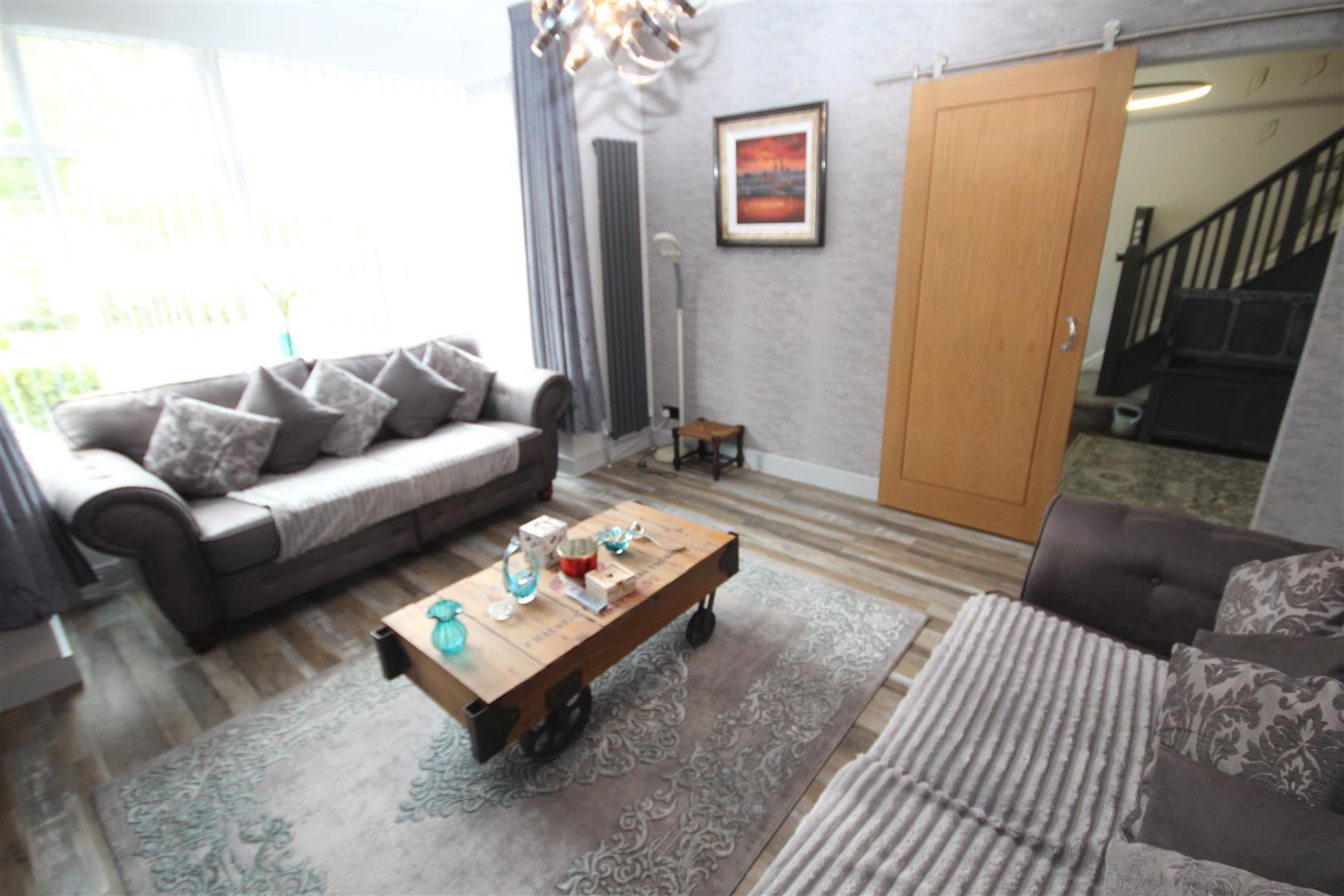 Front Lounge - 4.37m x 4.06m (14'4 x 13'4) - Double glazed square bay window to front aspect, gas fire stove in recess, large recess above set into the chimney breasting housing the 70" Samsung 4k tv and remote control, central heating radiator, safety glass sliding door into the hall