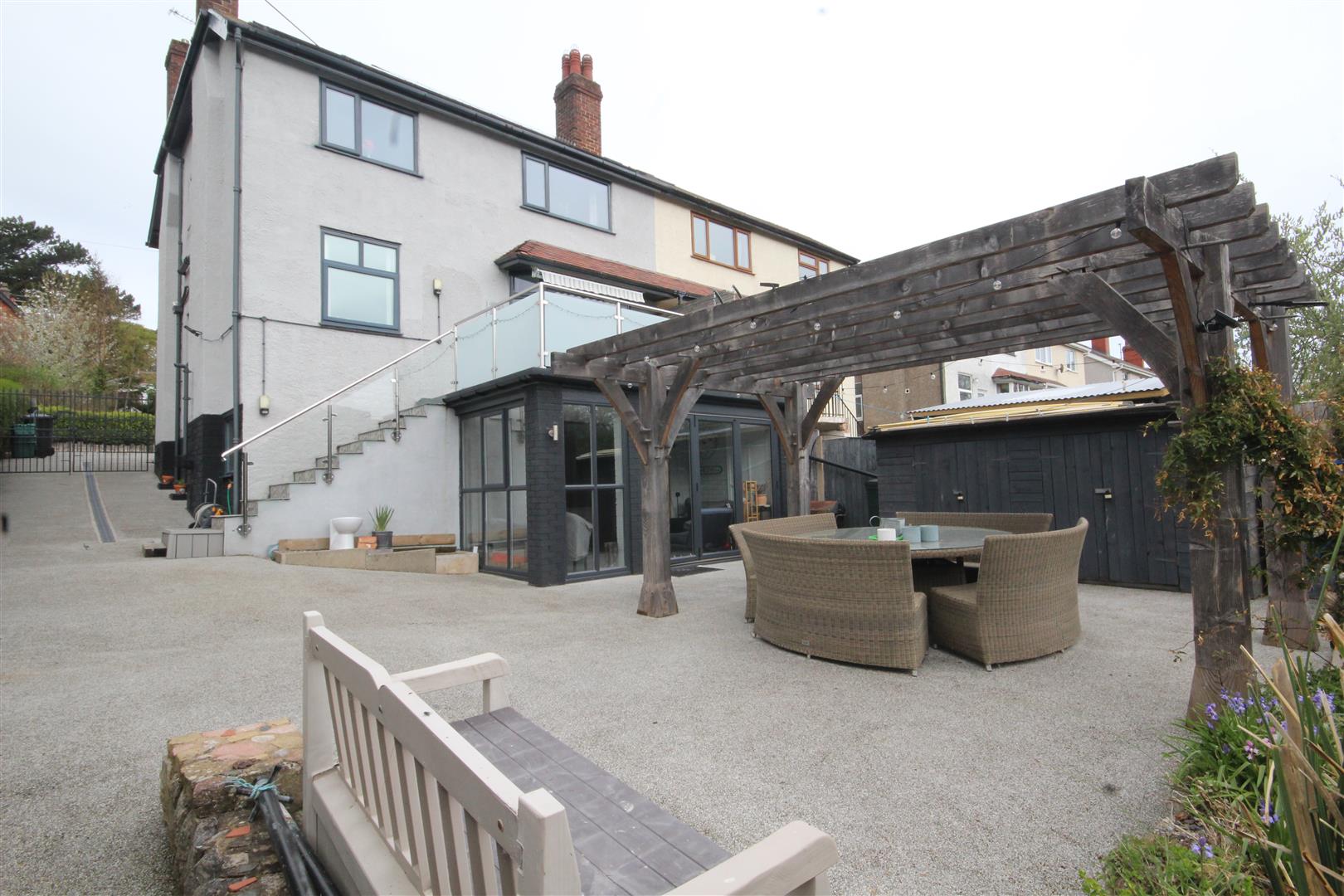 A fine SEMI DETACHED 4 BEDROOM FAMILY HOUSE of traditional style set in large rear gardens with BALCONY TERRACE, PATIO and CUSTOM PERGOLA. A particular feature is the lower level accessed by a spiral staircase off the kitchen which leads to a LOWER HALL and WASH ROOM, LARGE UTILITY and GARDEN LOUNGE/BAR GAMES ROOM with french doors leading onto the gardens. The house has been completely refurbished and transformed to a high standard resulting in a home having a unique style, tastefully decorated throughout and must be viewed to appreciate the extensive interior. Briefly the accommodation affords PORCH - HALL - LOUNGE - LARGE OPEN PLAN LIVING FITTED KITCHEN leading onto the BALCONY TERRACE - LUXURY MODERN BATHROOM & SHOWER - GAS C.H - DOUBLE GLAZING. Of particular note are the Solar Panels on the rear pitch providing cost effective electricity. The house is well placed for shopping in the West End and Rhos village. One of the most artistically updated houses in the area. There is a resin driveway and ample OFF ROAD PARKING. Tenure Freehold, Council Tax Band E. Energy Rating 79C Potential 81B Ref CB7896