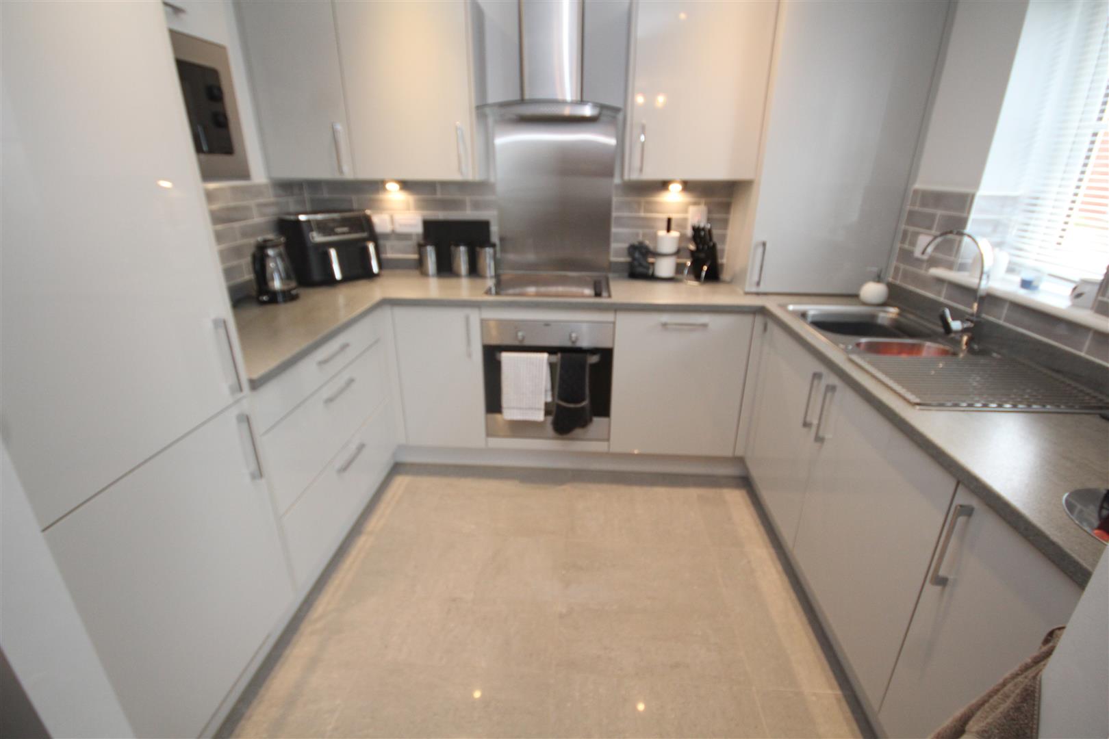Fitted Kitchen - 2.84 x 2.19 (9'3" x 7'2") - Double glazed window, central heating boiler within cupboard space, range of high gloss wall and base units with top work surfaces over and plinth lights, one and a half bowl stainless steel sink and drainer with mixer tap, integrated electric oven, four ring ceramic hob with extractor fan overhead, integrated fridge and freezer, dishwasher, washer/dryer, ceramic tile flooring.