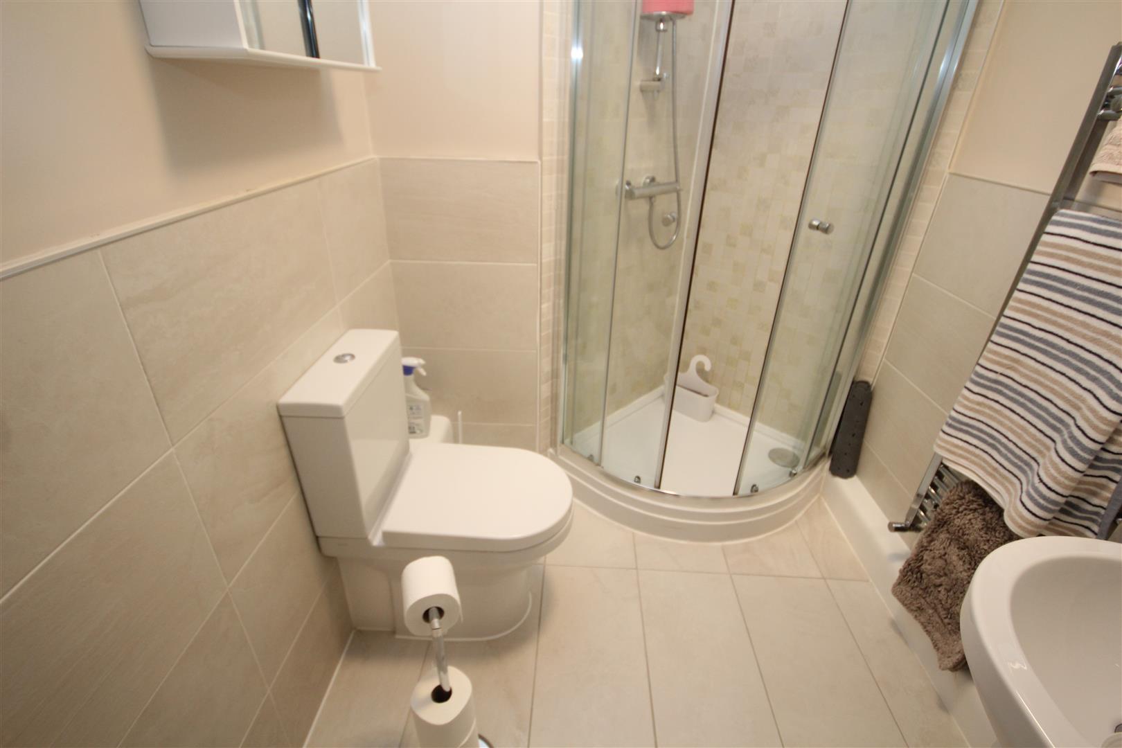 En Suite Shower Room - Quadrant shower cubicle with mains fed mixer valve, WC, pedestal wash hand basin with touch sensitive mirror above, shaver point, chrome heated towel rail, part ceramic tiled walls, ceramic tiled flooring.