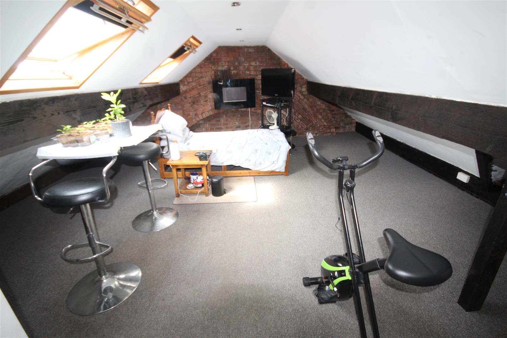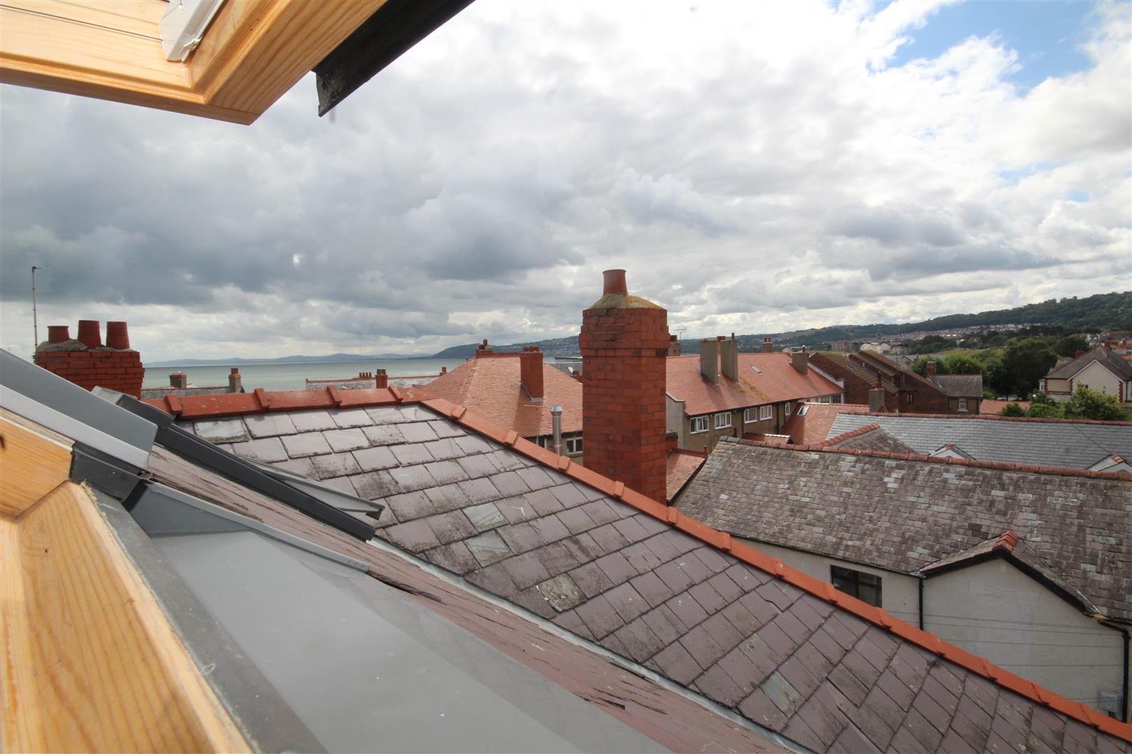 Superb Loft Hobbies Room - 7.39m x 5.59m max (24'3" x 18'4 max) - Accessed by a folding drop down ladder on the landing, pitched ceiling, 2 double glazed windows and aspect over Rhos and the sea, exposed brick walls at either end