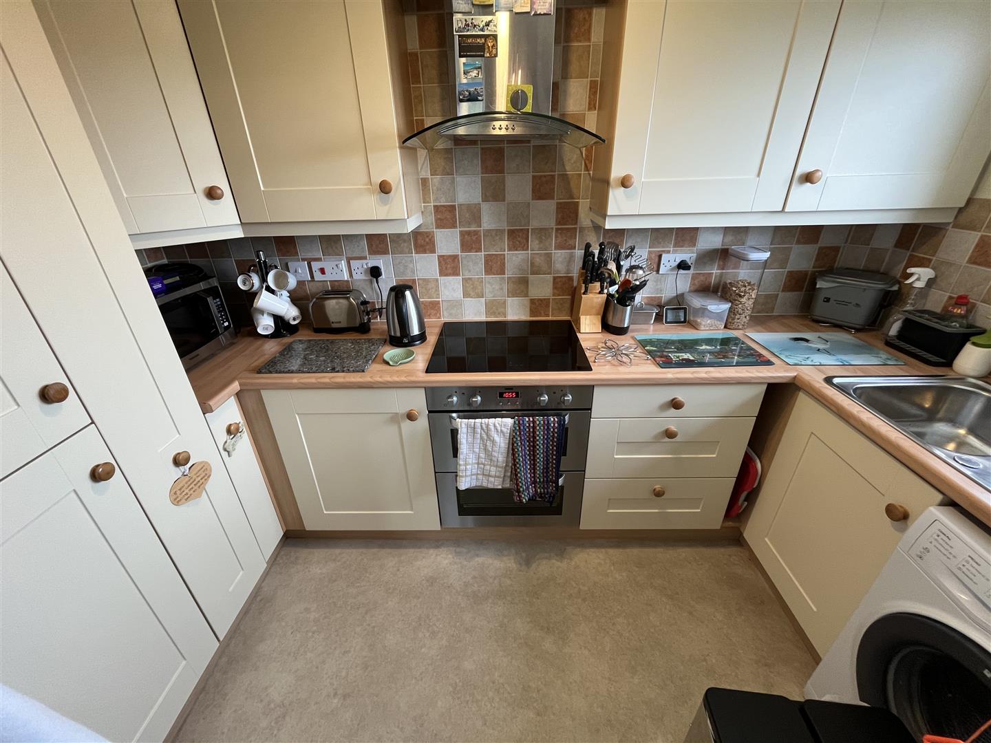 Fitted Kitchen - 3.1 x 1.7 (10'2" x 5'6") - Stainless steel sink unit, wall and base cupboards in a beech style, wood strip design work top surfaces, double glazed, coved ceilings, built in electric hob unit and oven, plumbing for washing machine, stainless steel cooker hood
