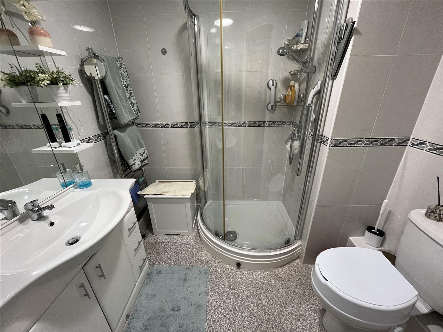 Shower Room - 2.1 x 1.7 (6'10" x 5'6") - Quadrant cubicle and unit, vanity wash hand basin, mirror, w.c, heated towel radiator, tiled wall