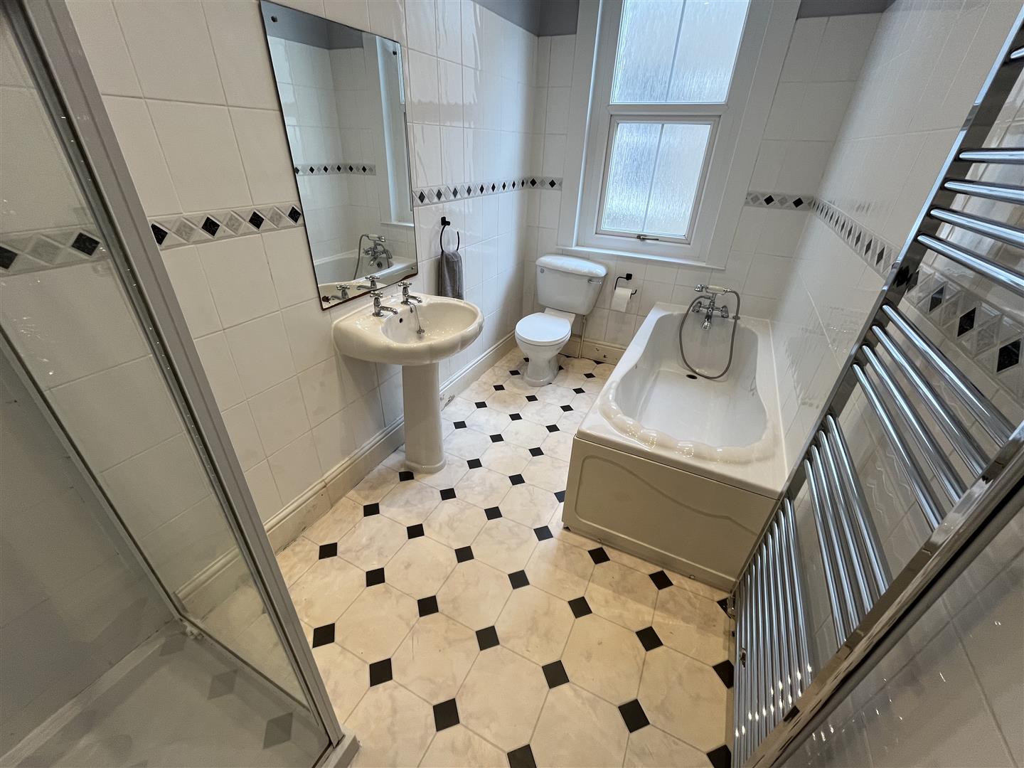 Bathroom - White suite of panel bath, w.c, pedestal wash hand basin, double glazed window, part tiled walls, shower cubicle and unit, inset ceiling lighting, heated towel radiator