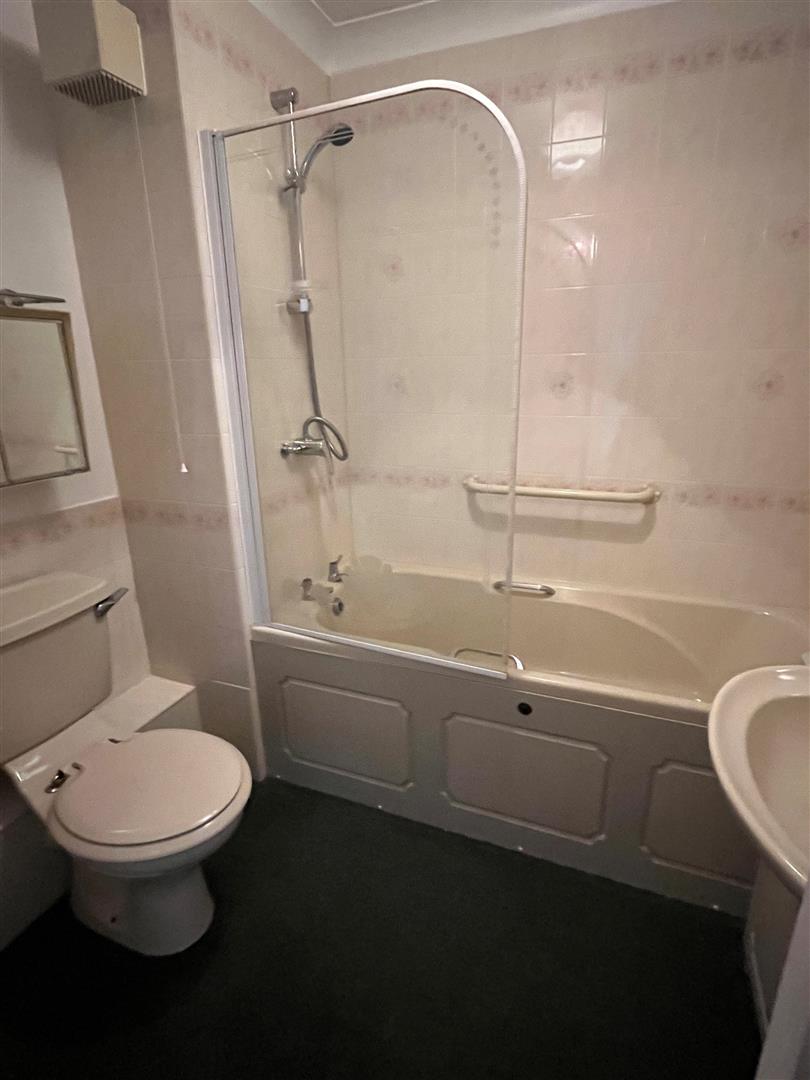 Bathroom - 2.13m 2.74m' x 1.83m 2.13m' (7' 9'' x 6' 7'') - Coloured suite comprising panelled bath with overhead shower and glass screen, pedestal wash hand basin with storage below mirror and light over, low level WC. Wall mounted mirror fronted bathroom cabinet. Coved ceiling. Part tiled walls.