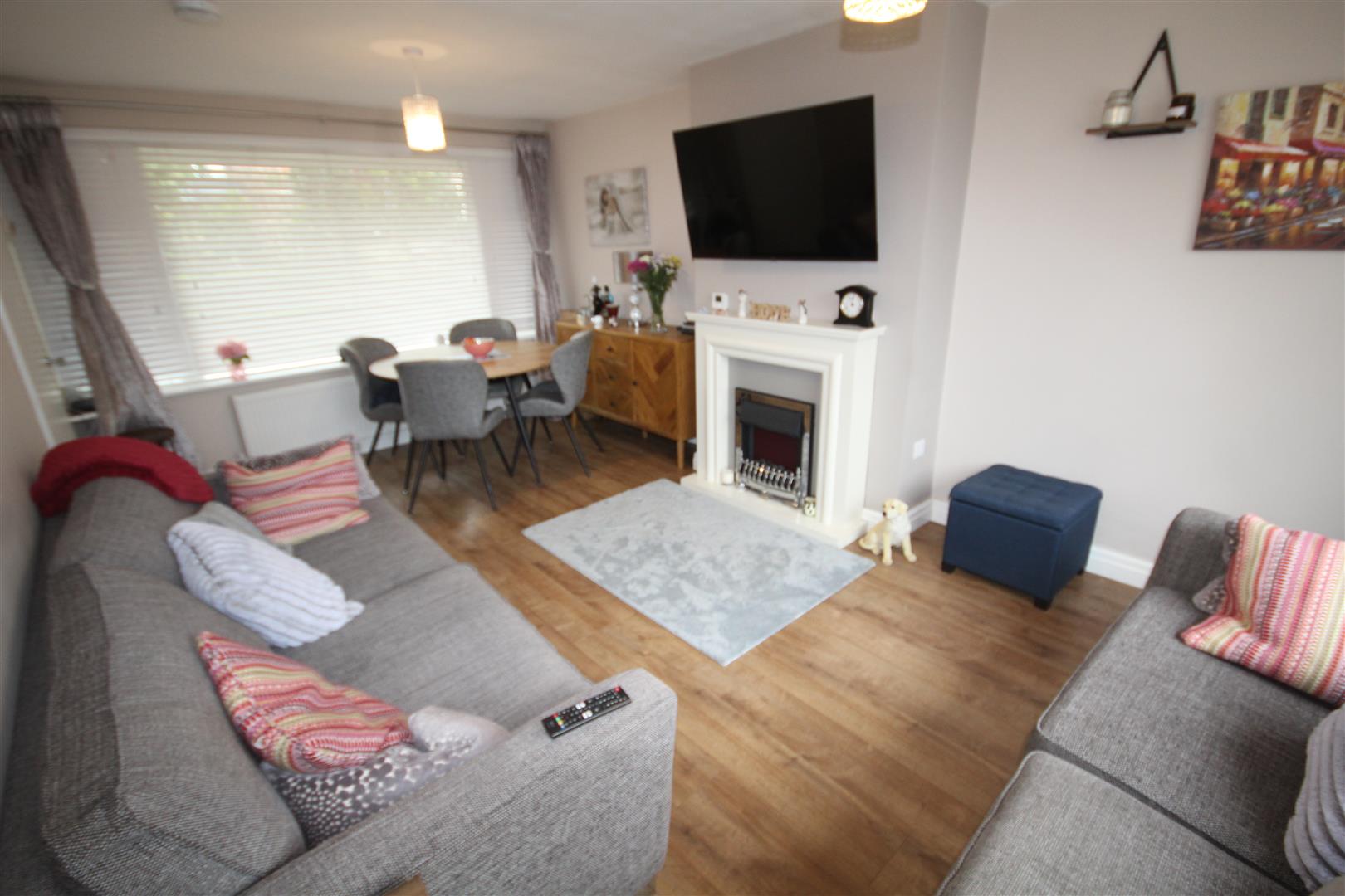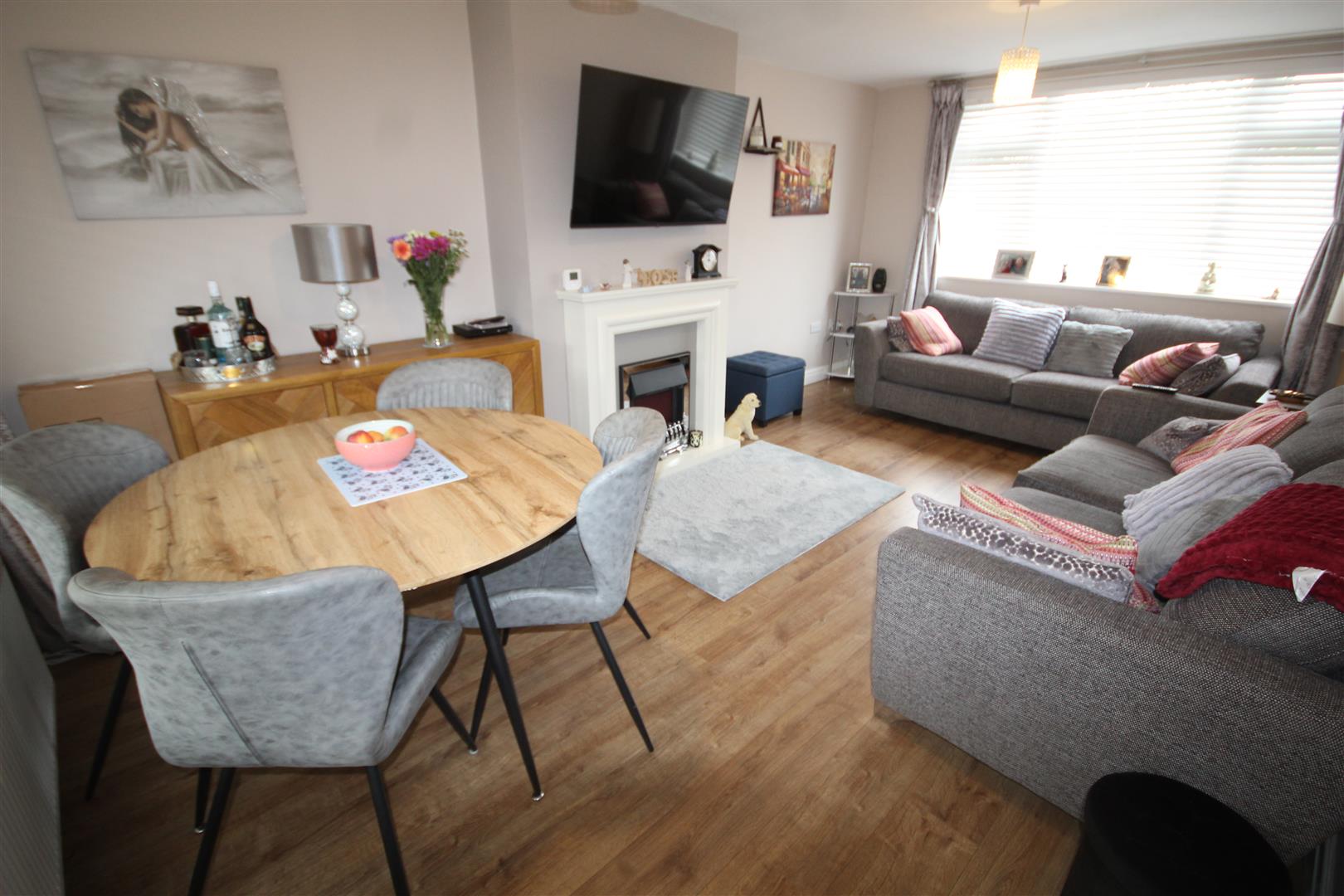 Lounge - 5.64m x 3.33m (18'6 x 10'11) - Laminate flooring, 2 double glazed windows, central heating radiator, fireplace surround and electric fire on hearth