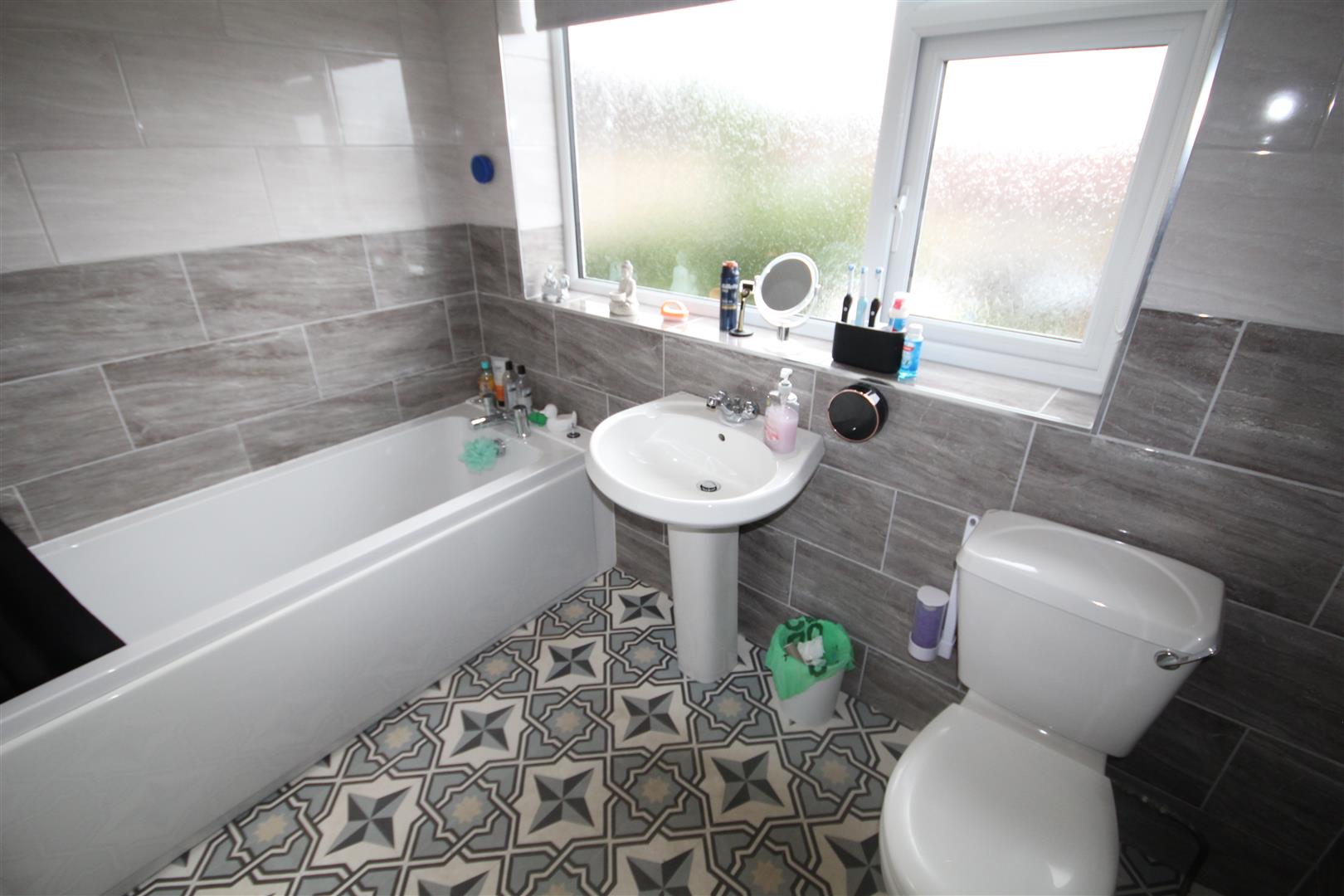Bathroom - 2.62m x 1.85m (8'7 x 6'1) - Panel bath, pedestal wash hand basin, w.c, two tone design grey tiled walls, shower unit, heated towel radiator
