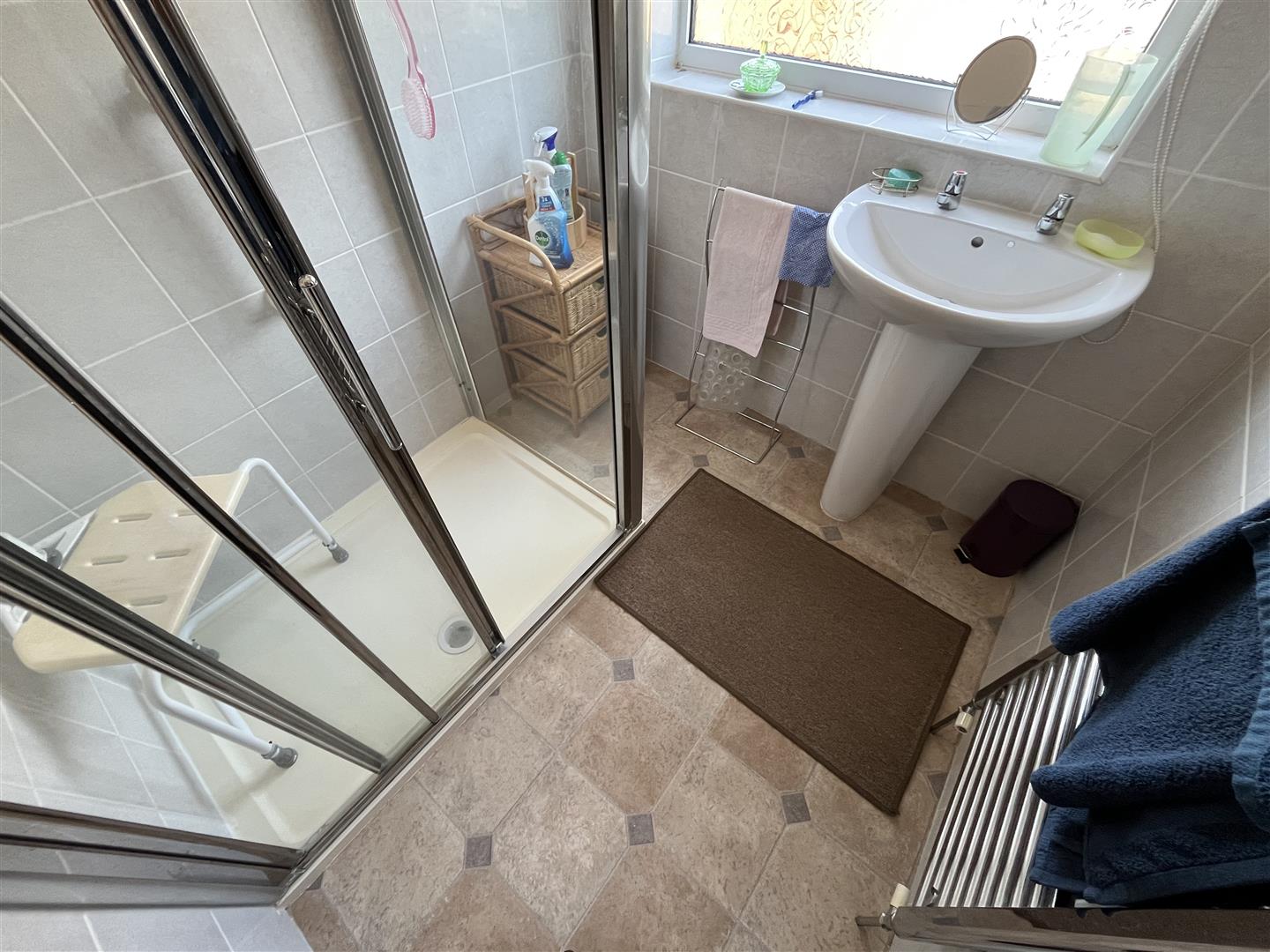 Shower Room - 1.9 x 1.7 (6'2" x 5'6") - Double shower cubicle and unit, pedestal wash hand basin, tiled walls, double glazed, heated towel radiator, Separate w.c, double glazed