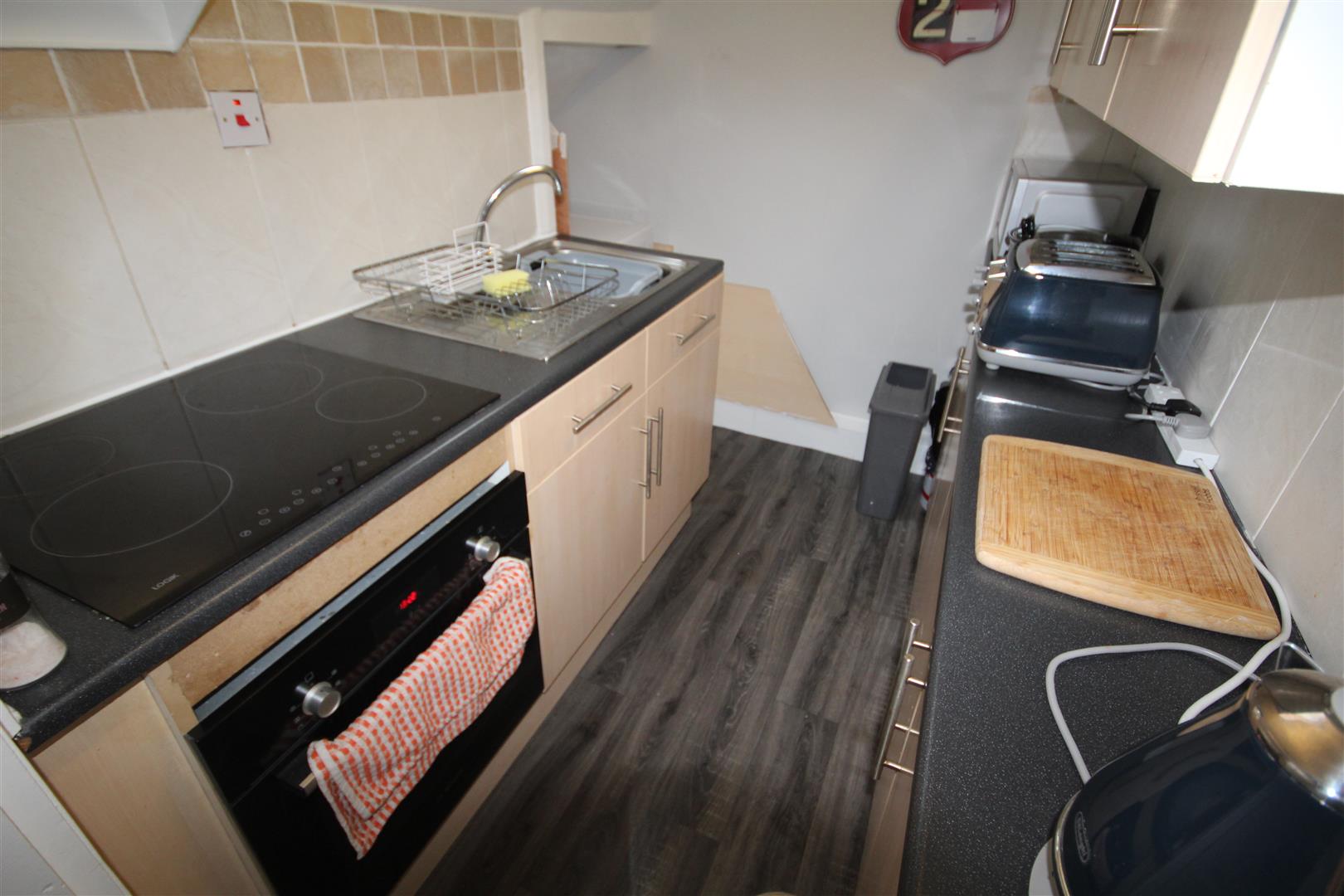 Galley Style Kitchen - 2.49m x 1.60m (8'2 x 5'3) - Stainless steel sink unit, double glazed velux window, base cupboards and drawers in a wood grain style, black work top surfaces, 4 ring electric hob unit, built in oven, tiled walls.