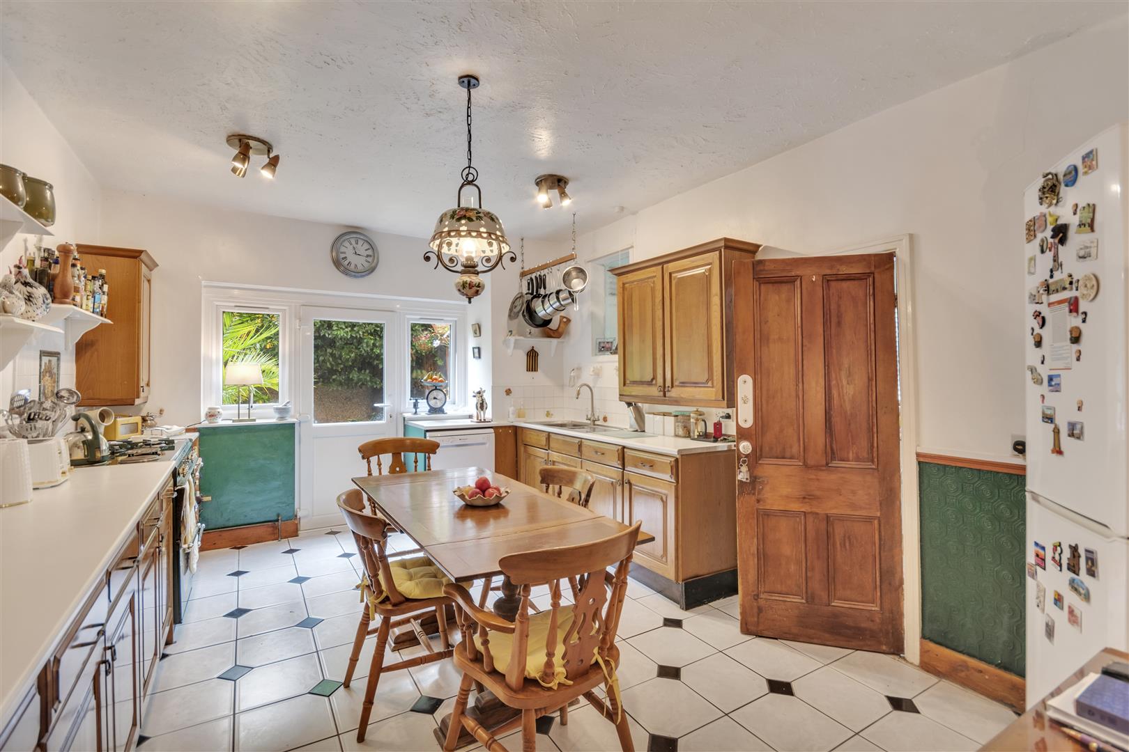 Kitchen Breakfast Room - 5.1 x 3.6 (16'8" x 11'9") - Range of Chestnut base cupboards and drawers, white work top surfaces, tiled floor, stainless steel sink unit, built in dishwasher, dado rail, Creda electric hob unit and gas range, wine store, double glazed window and door to rear gardens.