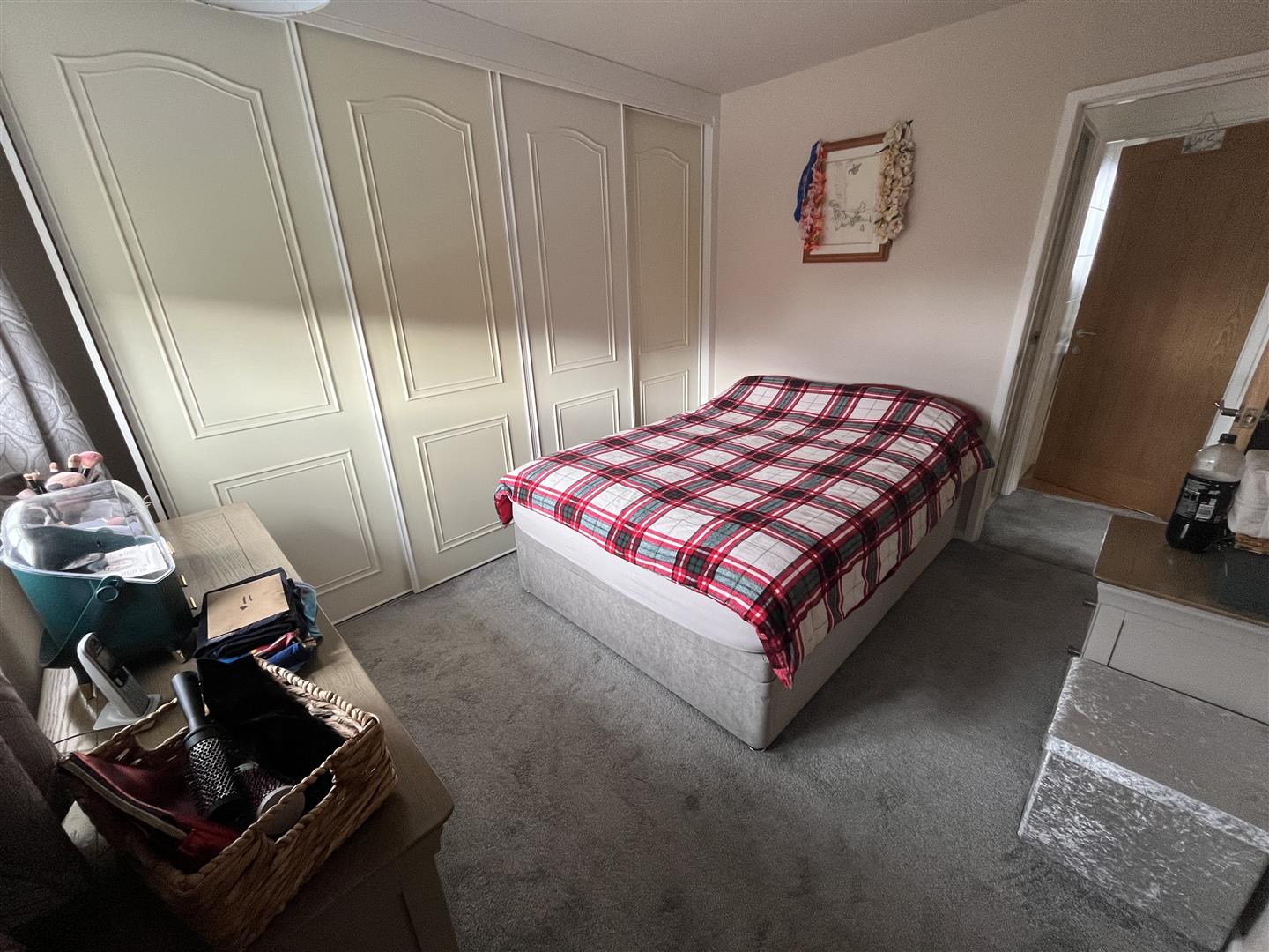 Bedroom 1 - 3.3 x 2.7 (10'9" x 8'10") - Fitted wardrobes with 4 sliding doors and shelving, dressing table, 2 wardrobes housing the Worcester gas central heating boiler, central heating radiator