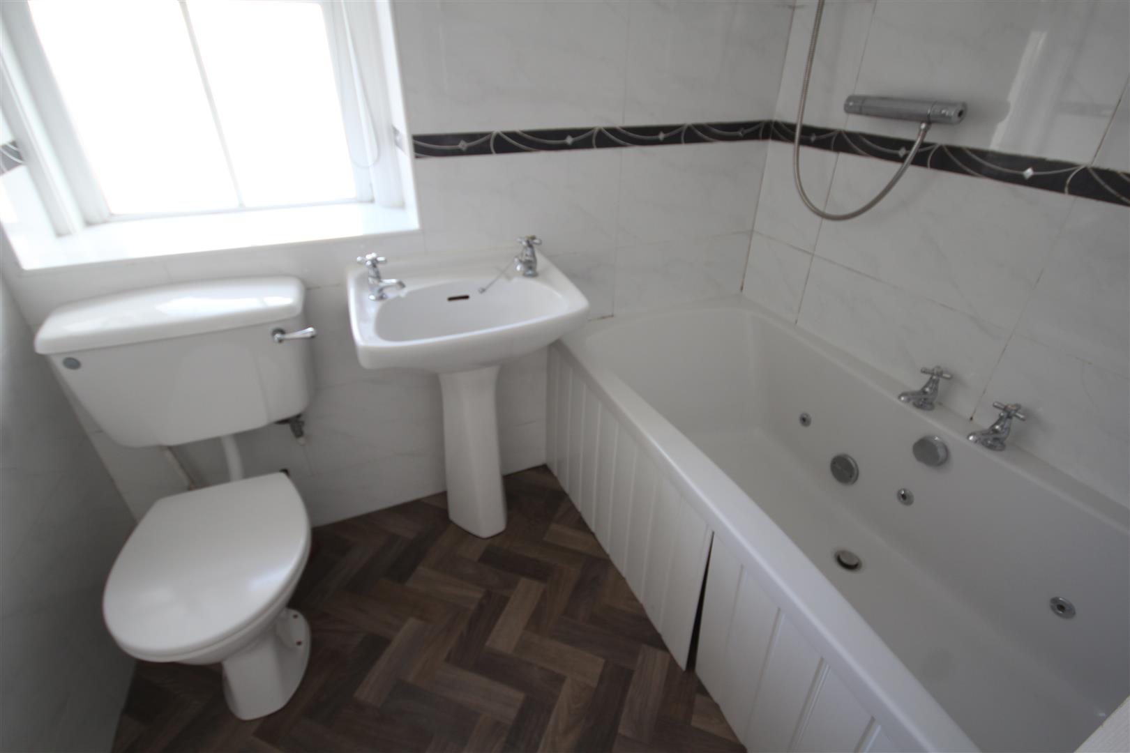 Bathroom - 2.06m x 2.06m (6'9 x 6'9) - White suite of panel bath, shower unit, w.c, pedestal wash hand basin, double glazed, white tiled walls, radiator