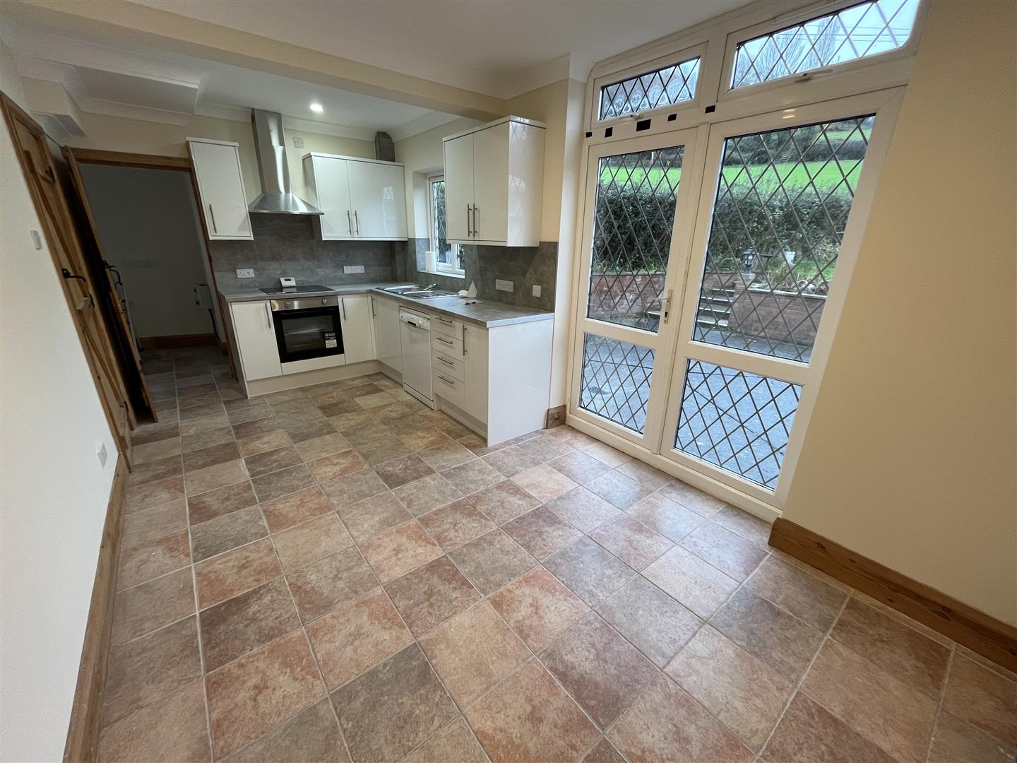 Large Kitchen Dining - 5.6 x 2.7 (18'4" x 8'10") - Tiled floor, double glazed french doors to rear gardens, central heating radiator, coved ceilings, stainless steel sink unit, range of pine style base cupboards and drawers, 4 ring electric hob unit, built in oven, cooker extractor hood, part tiled walls, plumbing for dishwasher