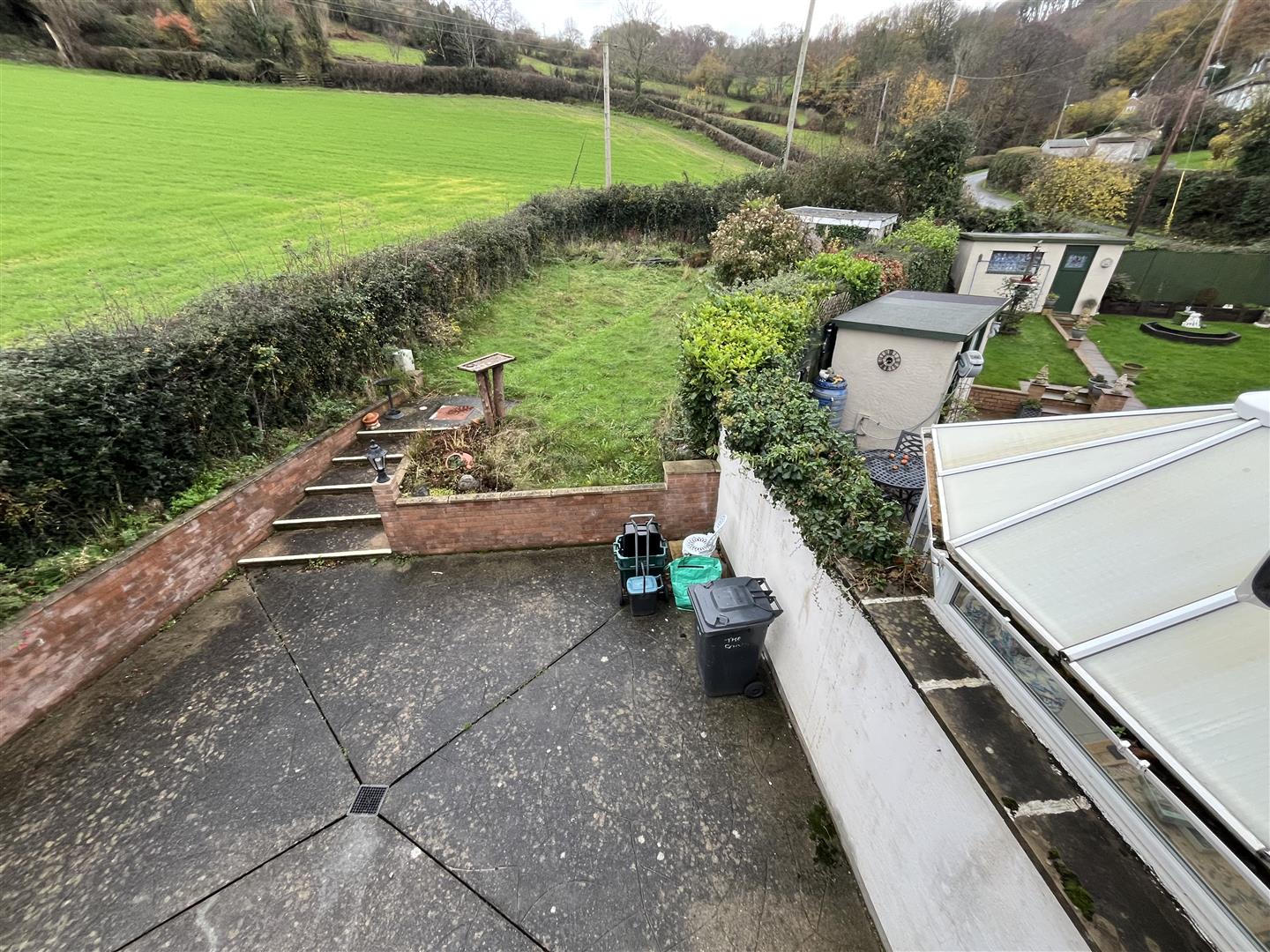 Outside - The front provides plenty of off road parking and turning area through wide double galvanised gates, At the back of the house is a patio area, grass lawn and an open covered porchway