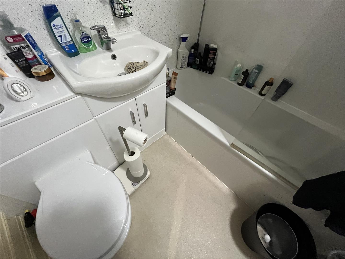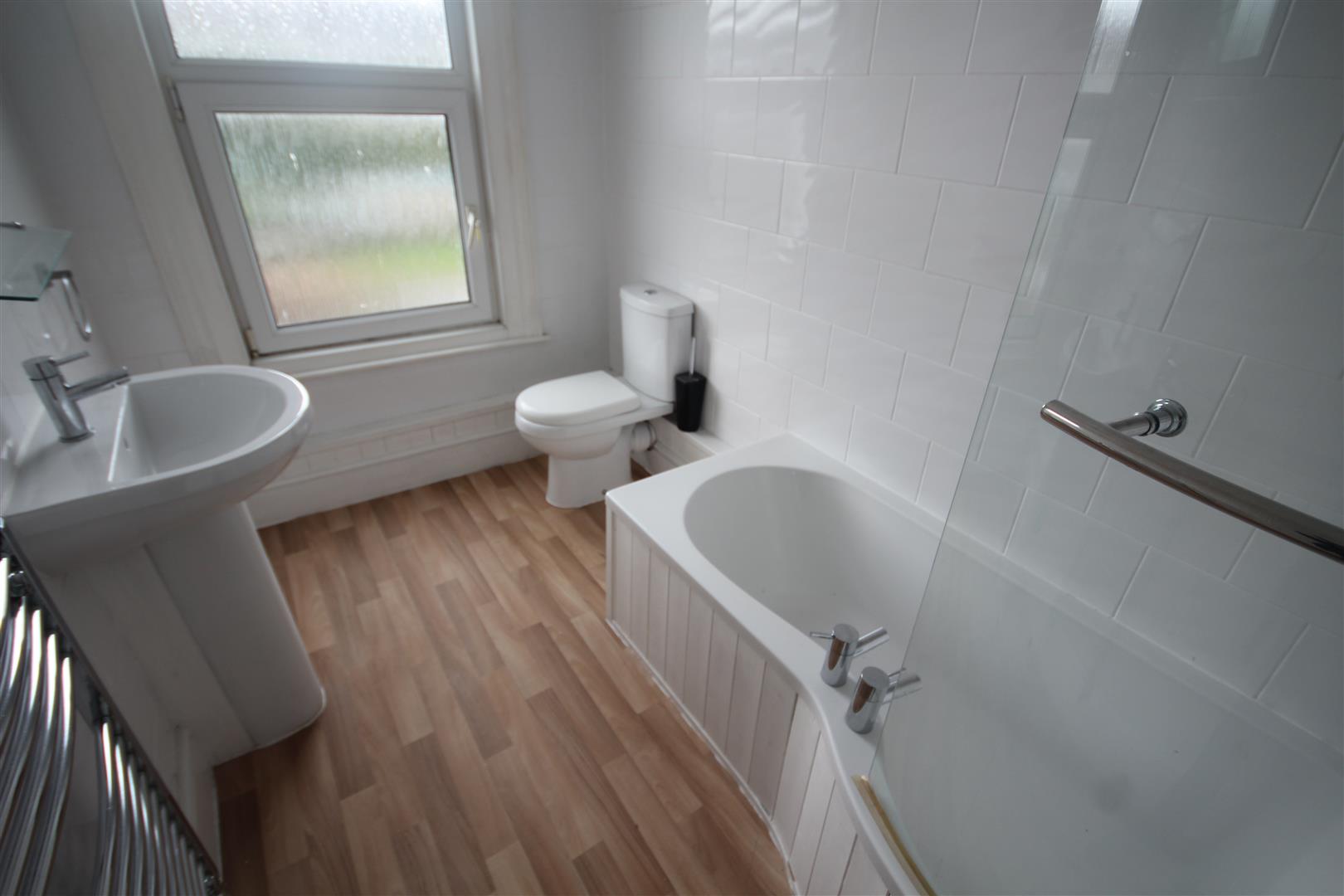 Large Bathroom - 2.84m x 1.70m (9'4 x 5'7) - Shower bath, shower unit and screen, pedestal wash hand basin, w.c, laminate flooring, double glazed window, central heating radiator, tiled walls