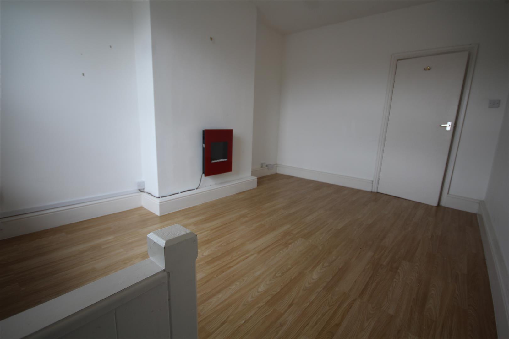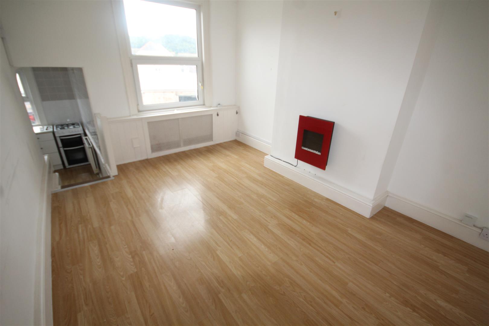 Lounge - 4.17m x 3.10m (13'8 x 10'2) - Laminate flooring, double glazed window, central heating radiator and cabinet, electric fire, distant hill views, 4 steps down to kitchen