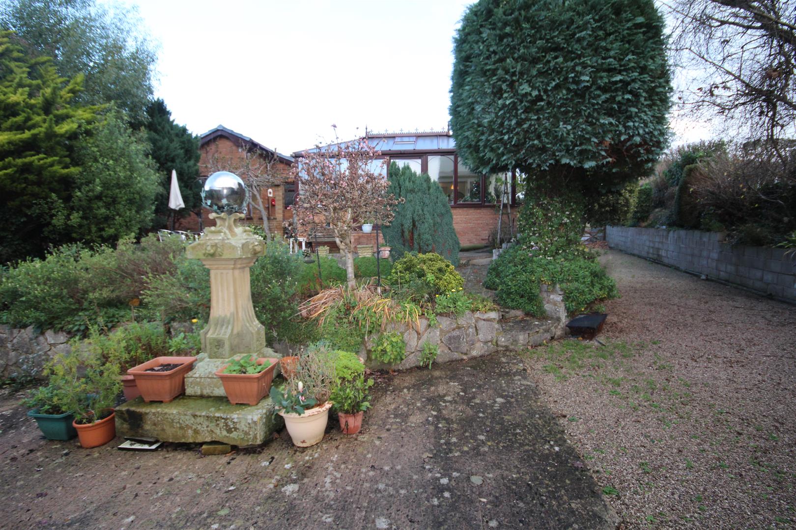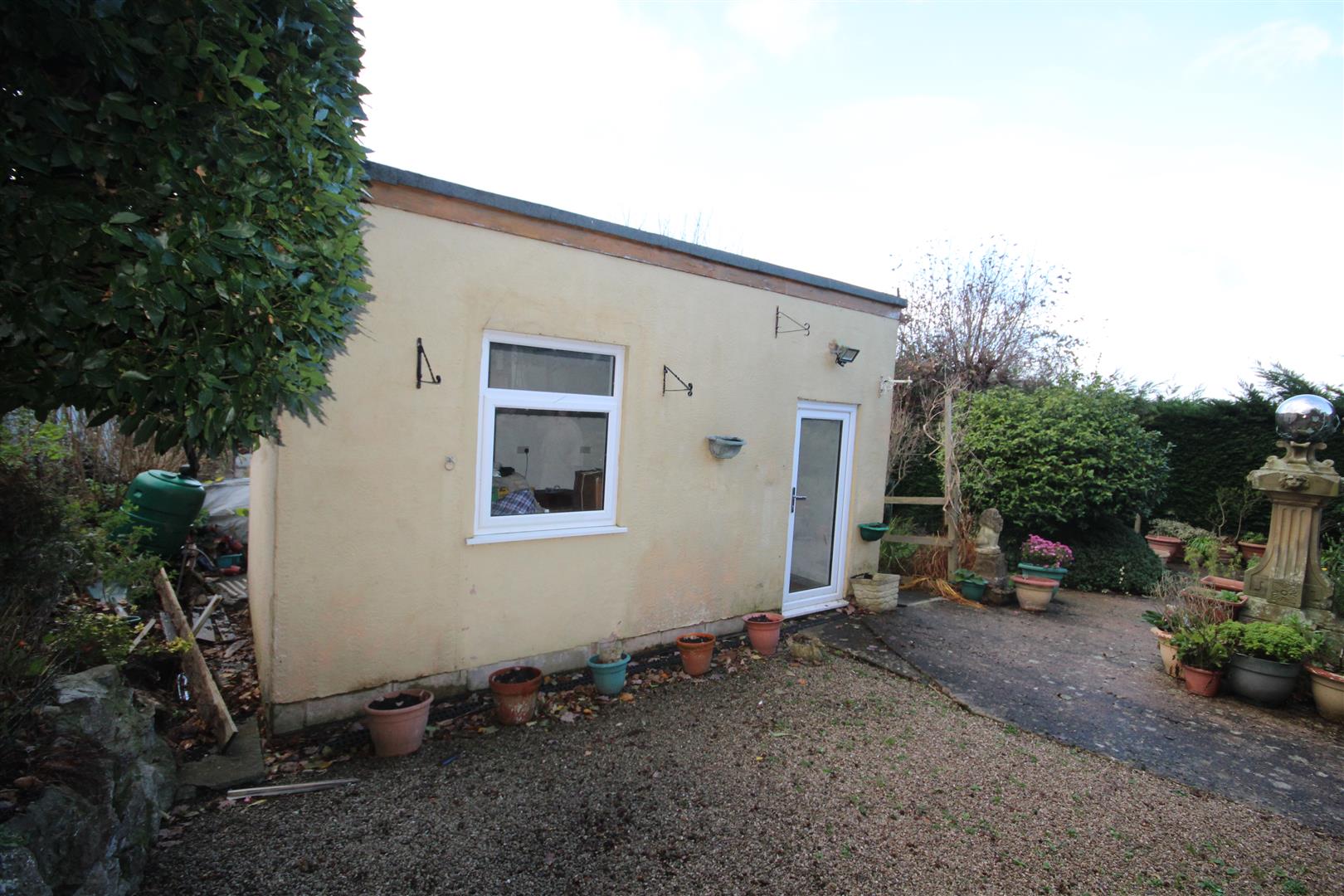 The Gardens - Large south facing rear gardens laid to lawn, flower trees and plants, flower borders and beds, patio courtyard, ADDTIONAL DRIVEWAY to the other side of the bungalow providing extra parking, ideal for those having a motor-home or caravan. Potting shed, greenhouse. Useful GARDEN STUDIO ROOM 4.8 x 2.9, power & light, double glazed door and window. Lawn garden to the front and flower borders.