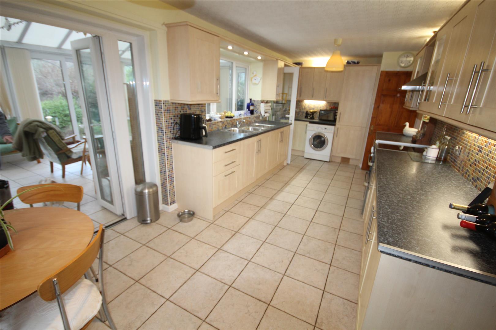 Large Dining Kitchen - 6 x 2.9 (19'8" x 9'6" ) - Stainless steel sink unit, plumbing for washing machine, cooker extractor hood, fridge freezer, pantry cupboard, tiled kitchen floor, 2 double glazed french doors, range of maple style base cupboards and drawers, wall units, work top surfaces