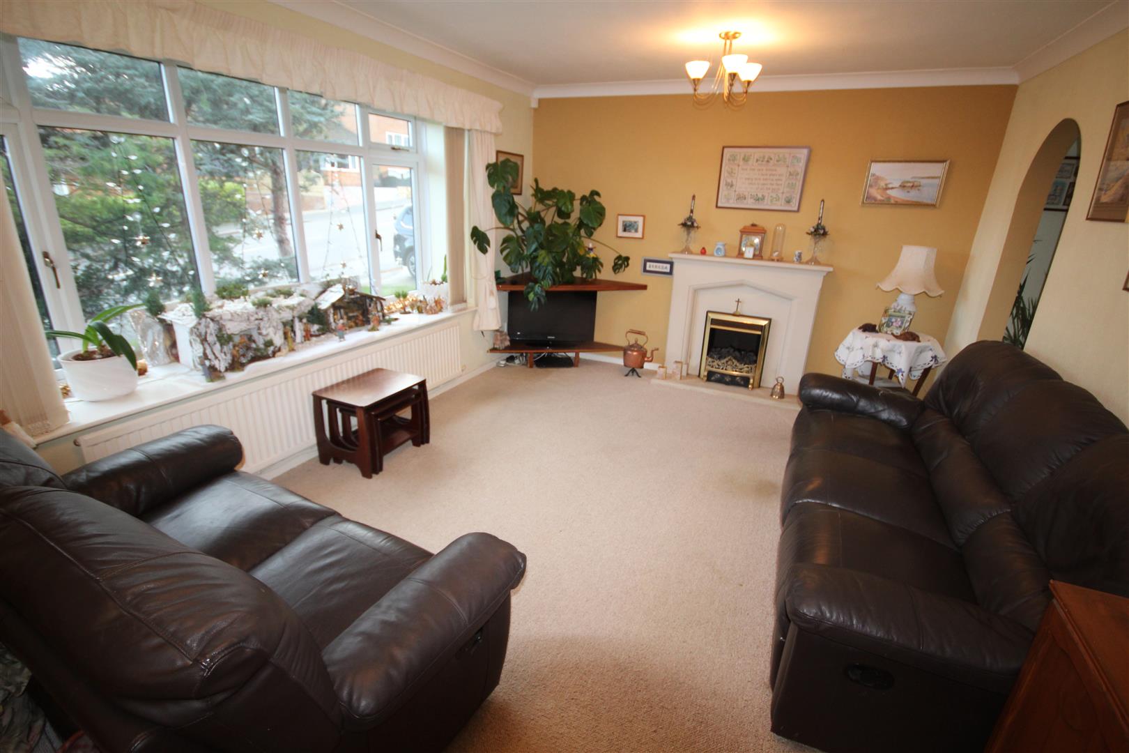 Lounge - 5.04 x 3.5 (16'6" x 11'5") - Double glazed window to front aspect overlooking the distant hills, central heating radiator, central heating radiator and coved ceilings, stone effect fireplace surround with electric fire, archway to