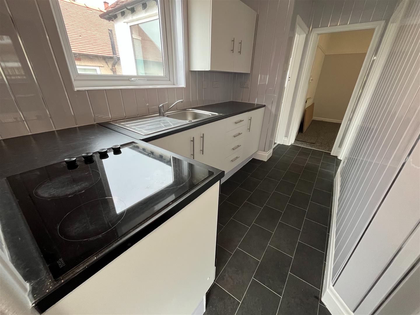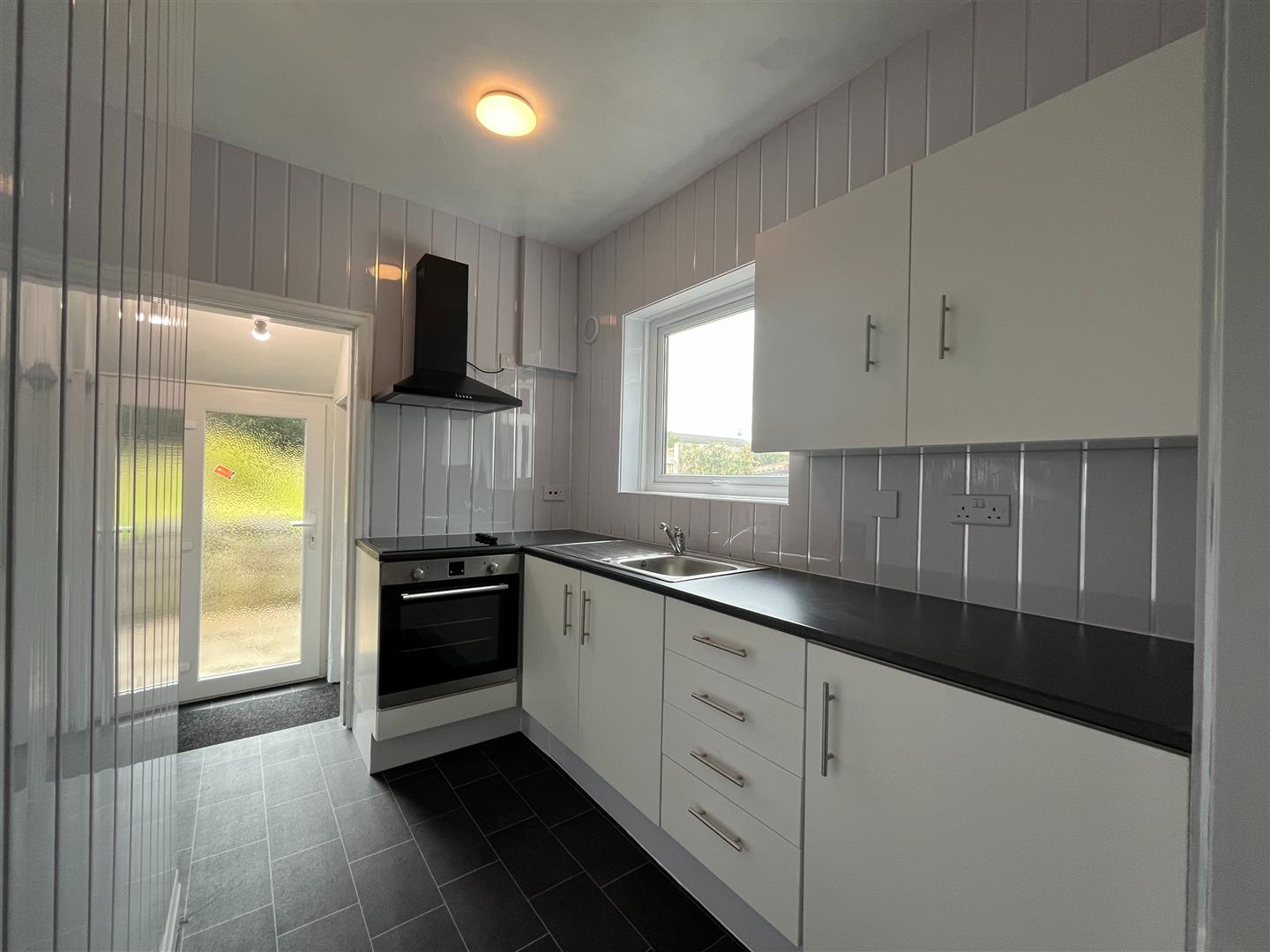 Fitted Kitchen - 2.7 x 1.7 (8'10" x 5'6") - Stainless steel sink unit, wall and base cupboards and drawers, black work top surfaces, double glazed, 4 ring electric hob unit, built in oven, cooker extractor hood, grey upvc cladding, double glazed