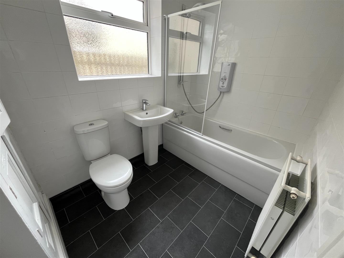 Modern Bathroom - 2.7 x 1.7 (8'10" x 5'6") - Panel bath, Mira shower, double glazed, pedestal wash hand basin, w.c, double glazed, central heating radiator, double door airing cupboard