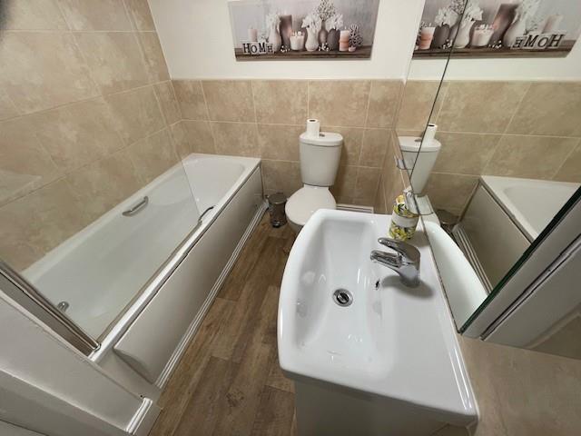 Bathroom - Panel bath, shower unit and screen, w.c, wash hand basin, half tiled walls, cylinder airing cupboard