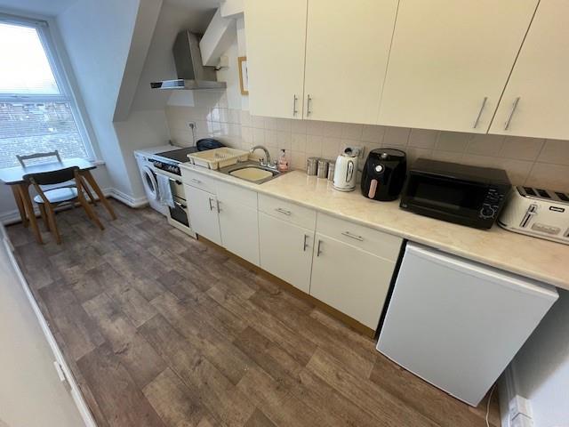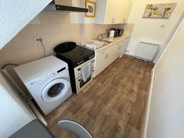Kitchen - 4.9 x 1.8 (16'0" x 5'10") - Stainless steel sink unit, double glazed window, wall and base cupboards, plumbing for washing machine, cooker extractor hood, night storage heater