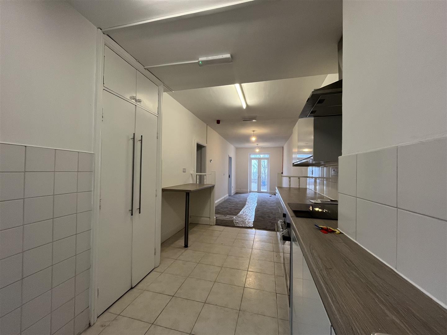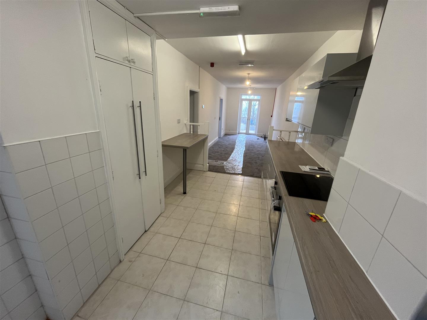 Long Kitchen Dining & Living Room - 11.1 x 2.5 (36'5" x 8'2") - Stainless steel sink unit, tiled floor, plumbing for washing machine, white base cupboards and black work top surfaces, cooker extractor hood, wall units, double door cupboard, central heating radiator, glazed double doors to bedroom and double glazed french doors to rear garden