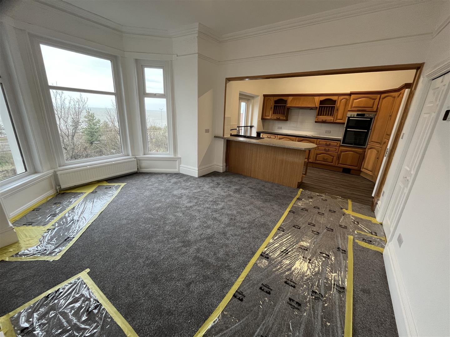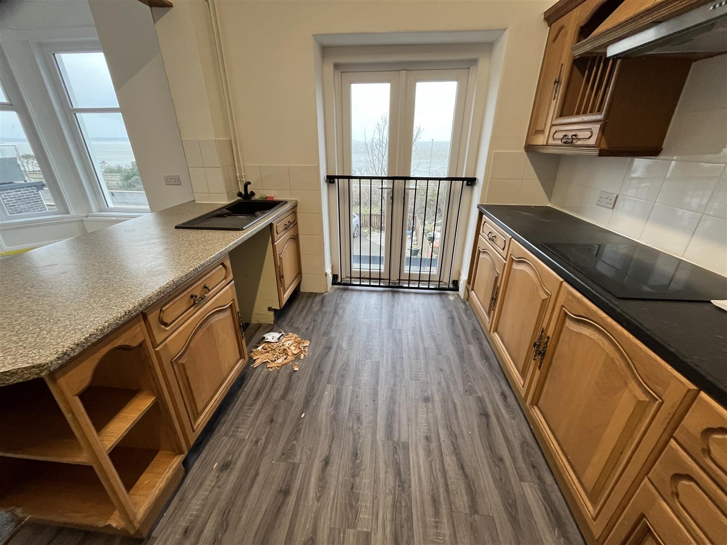 Large Fitted Open Plan Lounge Kitchen - 7.2 x 4.9 (23'7" x 16'0") - Single drainer sink unit, range of oak style base cupboards and drawers with terrazzo effect work top surfaces, peninsular cupboards, double glazed bay window overlooking the views out to sea and Anglesey, double glazed french doors, double door cupboards, fireplace surround, 5 ring gas hob unit, cooker extractor hood, built in oven, plate rack