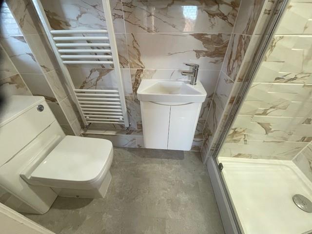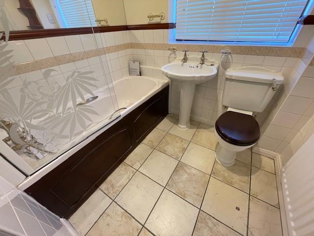Bathroom - 2.1 x 1.8 (6'10" x 5'10") - Panel bath, shower taps, tiled floor, pedestal wash hand basin, w.c, central heating radiator, shaver point, cylinder airing cupbord