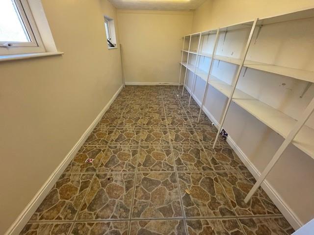 The Garage - 5.02 x 2.4 (16'5" x 7'10") - Now made into a work room, utility store, 2 double glazed windows, up and over door partitioned off, range of shelving units