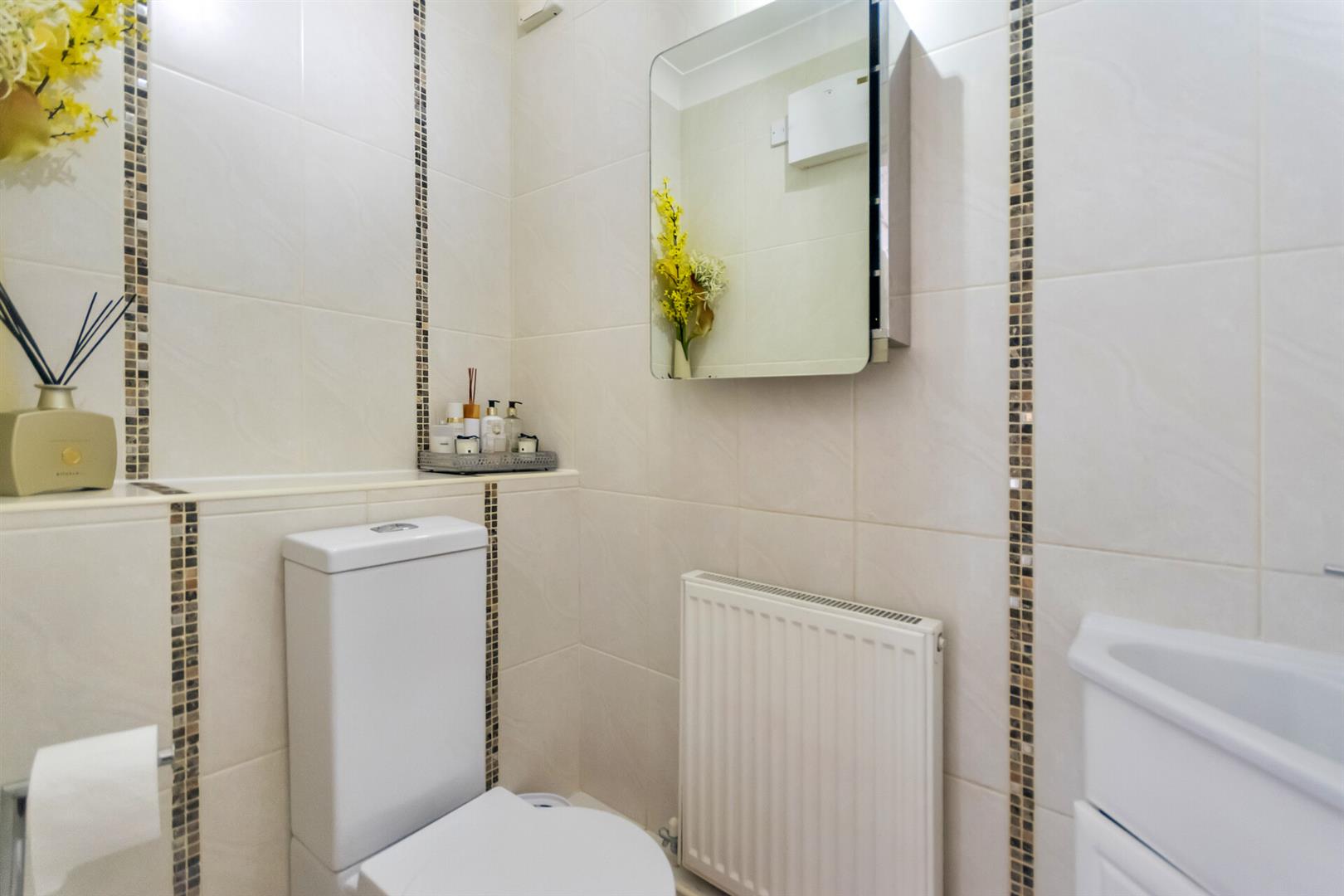 Cloakroom - W.C, wash hand basin, tiled floor and walls, mirror, central heating radiator