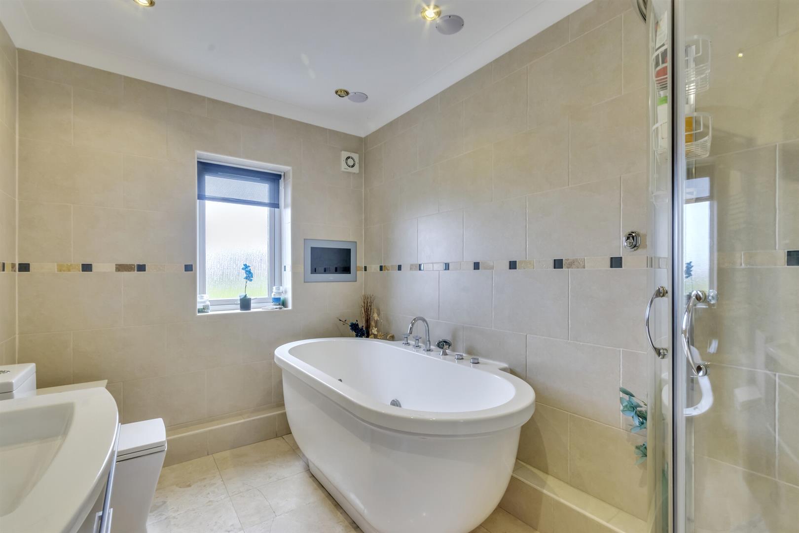 Family Bathroom - 3.51m x 3.00m (11'6 x 9'10) - Oval jacuzzi bath, w.c, vanity wash hand basin, double glazed, tiled walls and floor, heated towel radiator, built in tv, quadrant shower cubicle and unit