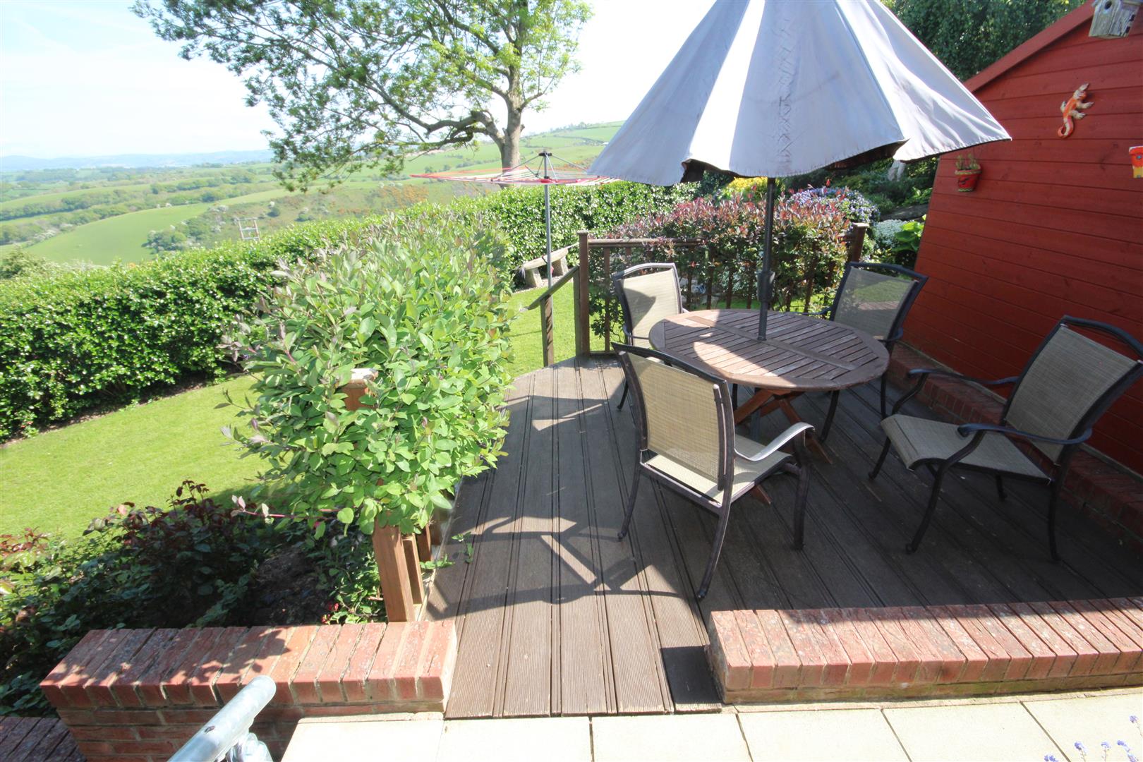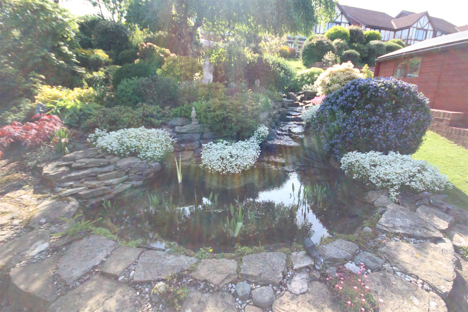 The Gardens - These are an absolute delight having ben landscaped and well tended by the present owner with lawn areas, well stocked flower beds and borders, honeysuckle, rose trees, trellis arch with climbing clematis At the side of the house is a Yorkshire stone patio area and next door is a long waterfall with a 2 speed motor set in stone rockeries and flowering plants. This makes a lovely relaxation area overlooking the hill and sea views